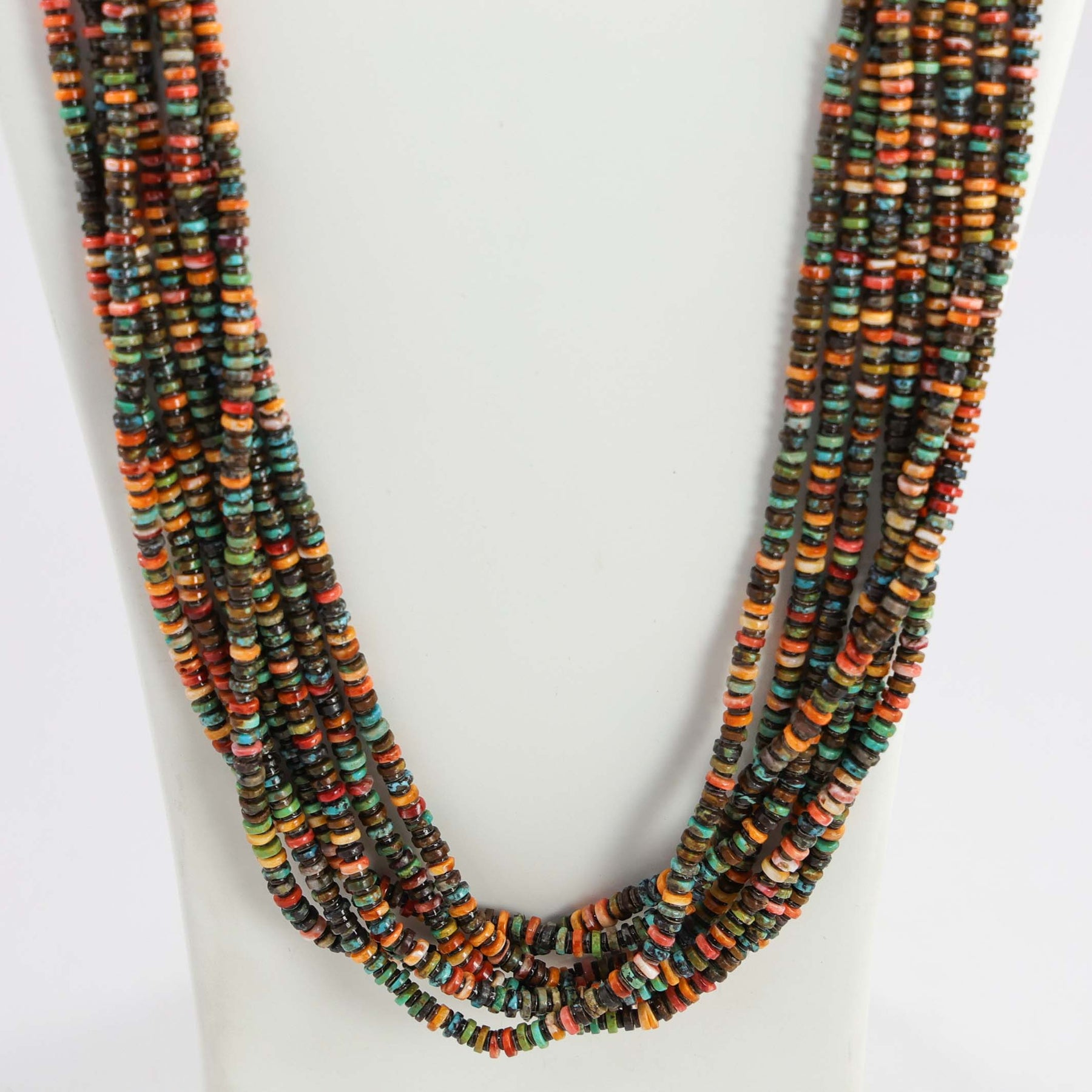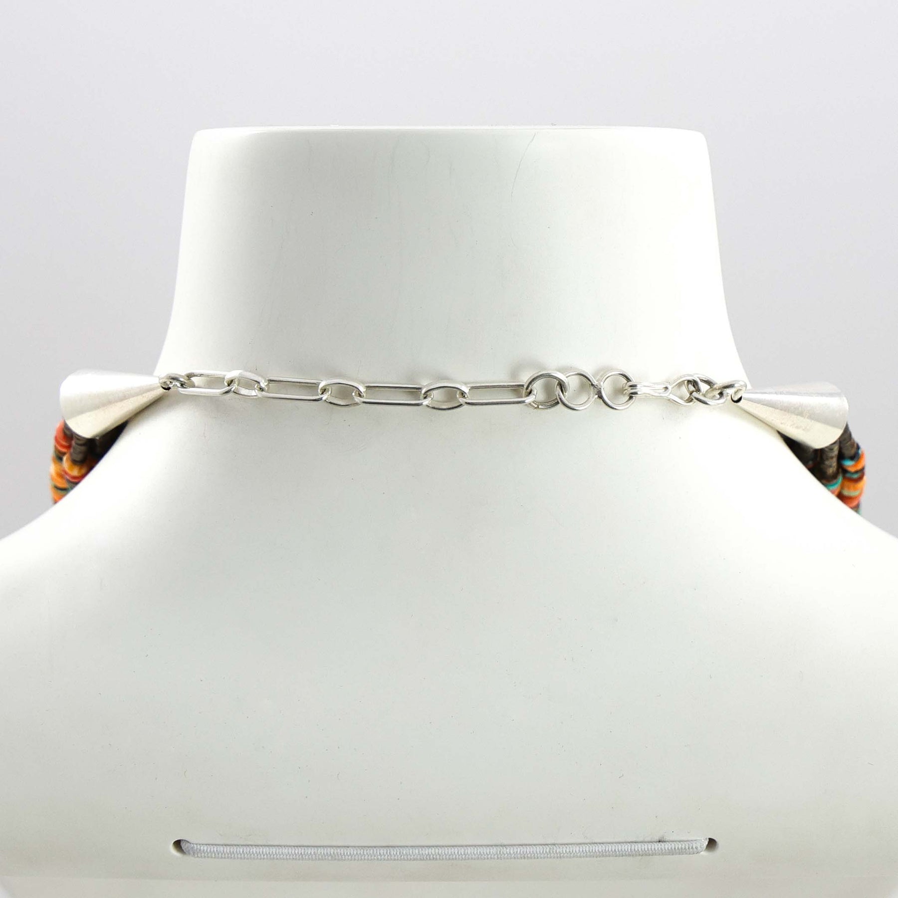 Seven-Strand Necklace with Hand Rolled Heishi Beads made from Spiny Oyster Shell, Stabilized Nevada Green Turquoise, and Pen Shell Spacer Beads bordering a Sterling Silver Clasp and Cones.