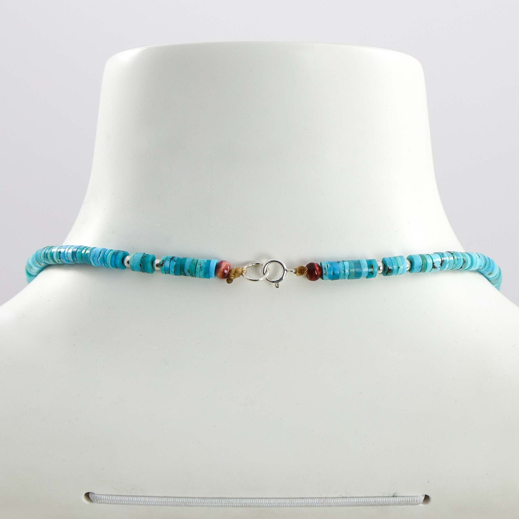 Single Strand Necklace with Hand-Rolled Stabilized Kingman Turquoise Heishi Beads and Spiny Oyster Shell Tabs.