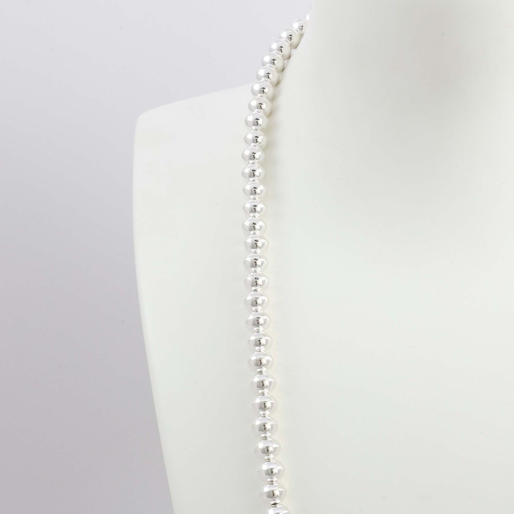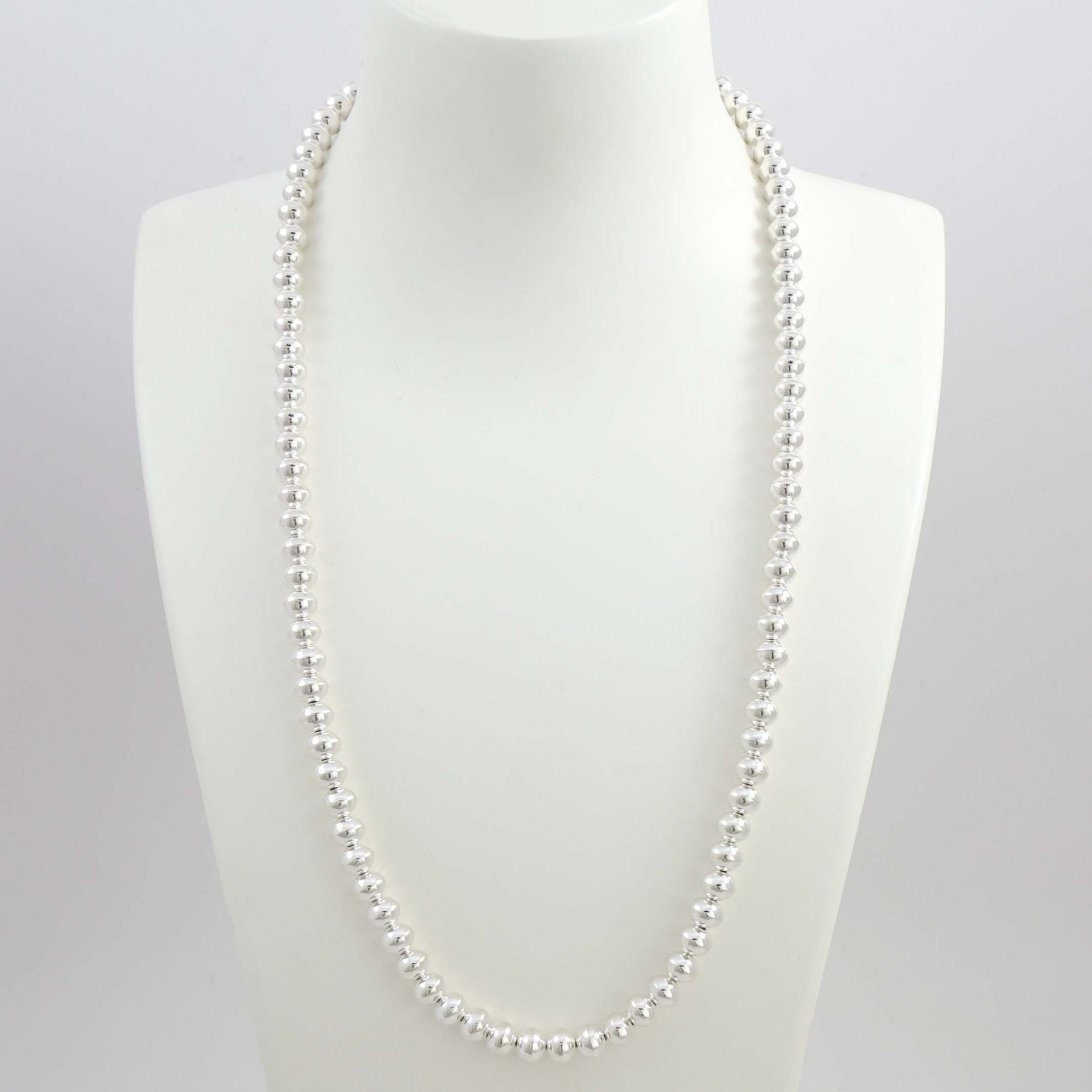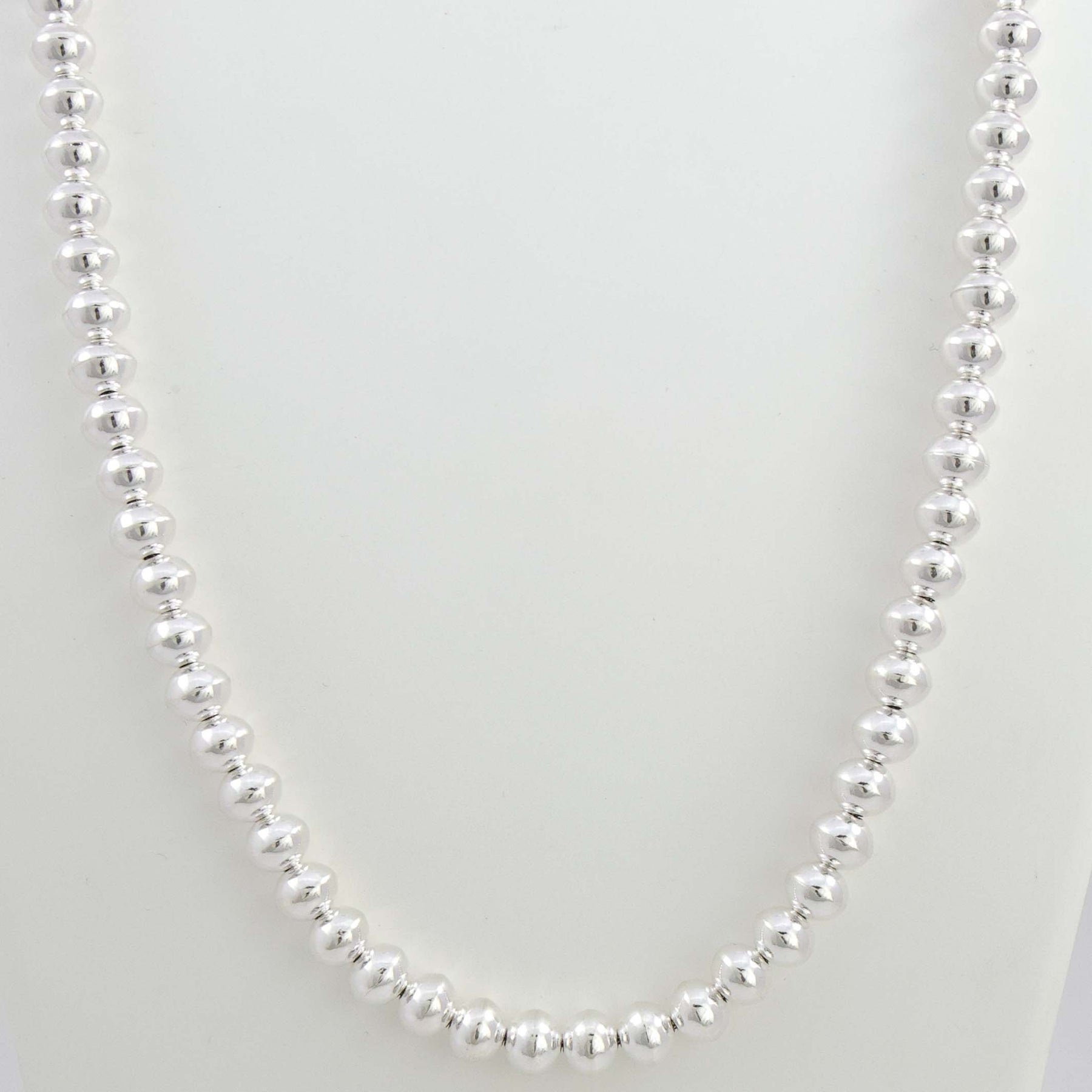 Single Strand Sterling Silver Navajo Pearl Necklace with Handmade Beads in a High Polish Finish.