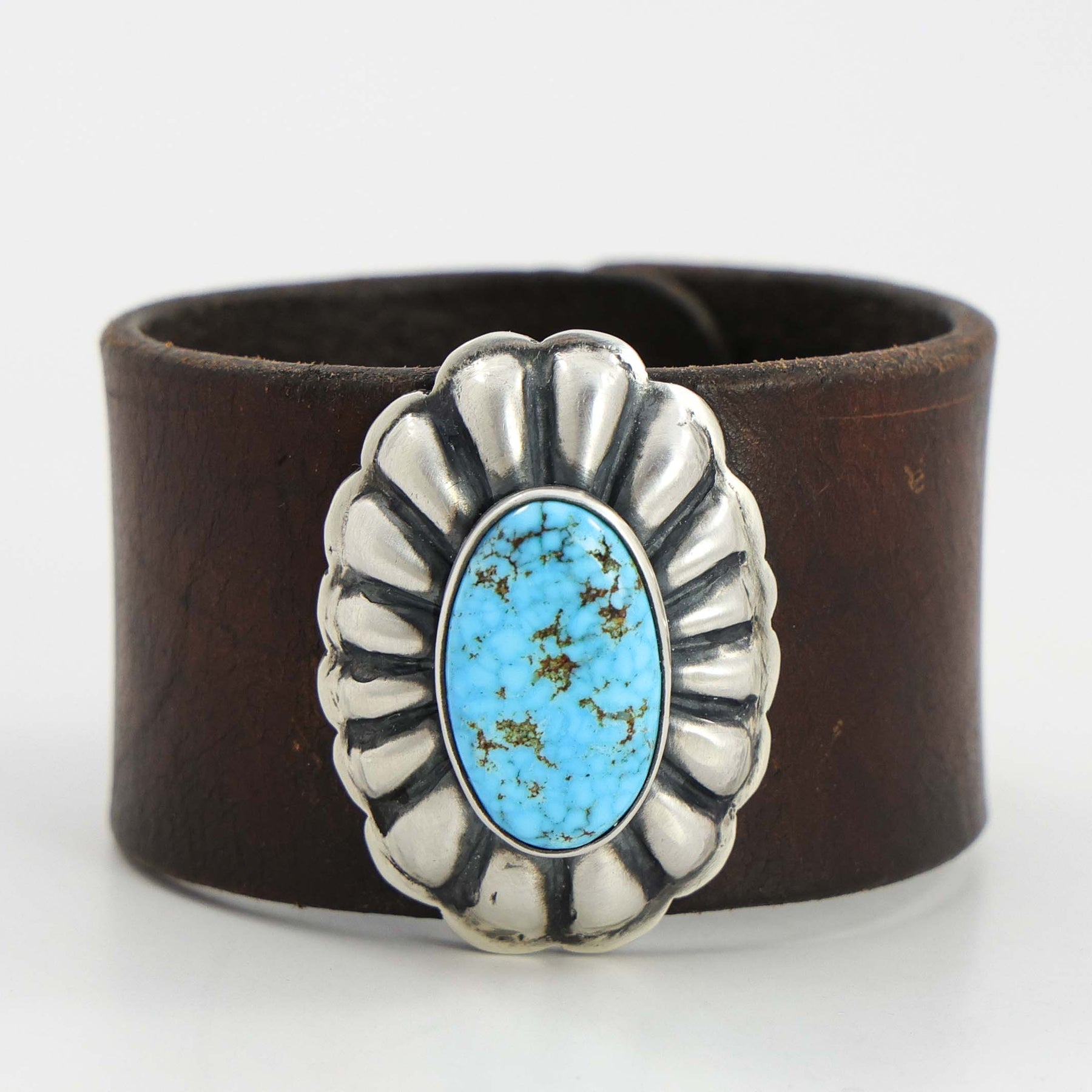 Brown Leather Bracelet with a Sterling Silver Concho set with Natural Ithaca Peak Turquoise from Arizona.