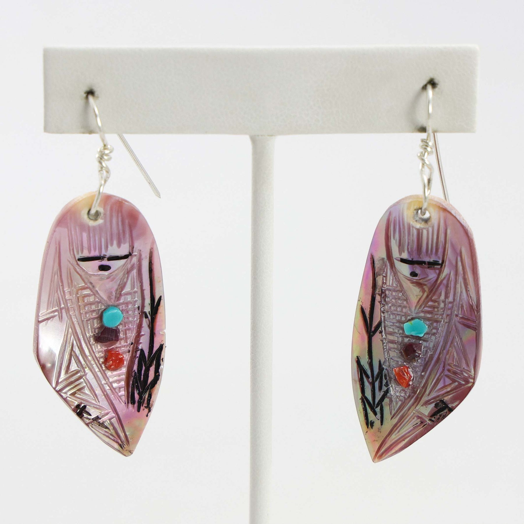 Sterling Silver French Hook Earrings with Corn Maiden Fetishes Hand-Carved from Mother of Pearl Shell with Inlaid Coral, Sugilite, and Turquoise by Zuni Artist, Gloria Chattin.