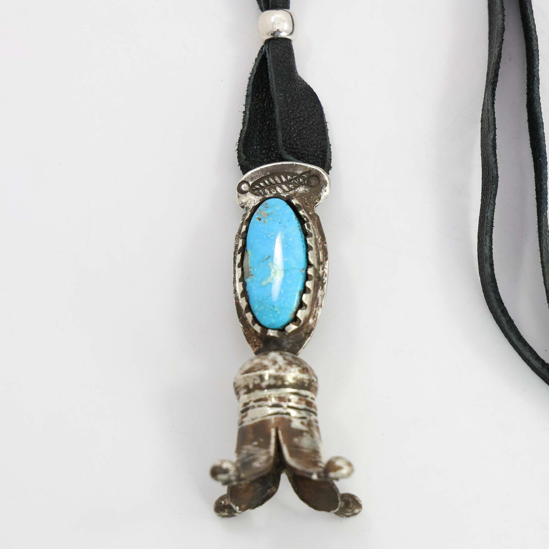 Hand-Forged Coin Silver Squash Blossom Pendant set with Natural Blue Gem Turquoise on a 30” Adjustable Black Leather Cord.