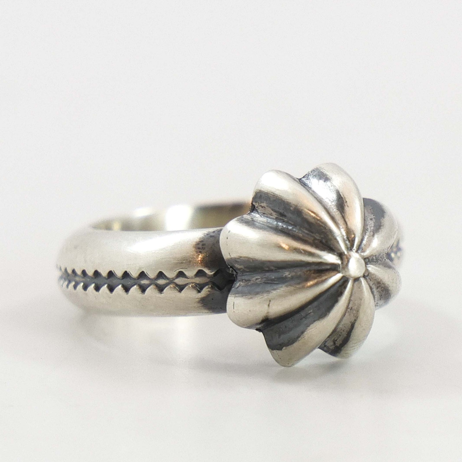 カイルの母方の曾祖父と曾祖母はジュエリーの仕事に携わり、世代を超えて技術を伝え、カイルと彼の兄弟は 4 代目の銀細工師となりました。カイルは、ナバホ真珠や、一本鎖のネックレスから伝統的なスカッシュの花まで、フルーテッド デザインのビーズ細工を作ることに熟練しました。彼は、ペンダント、イヤリング、ボロタイなど、他の種類のジュエリーも完成させてきました。カイルは、ナンバー エイト、モレンシー、ブルー ジェム、キングマン、カリコ レイクなどの天然ターコイズを使用するのが好きです。