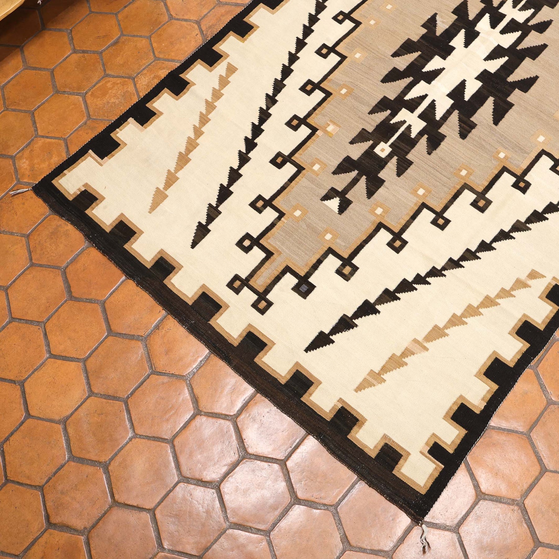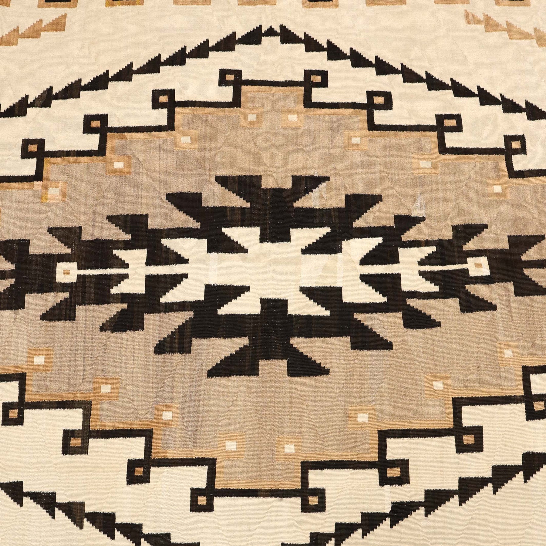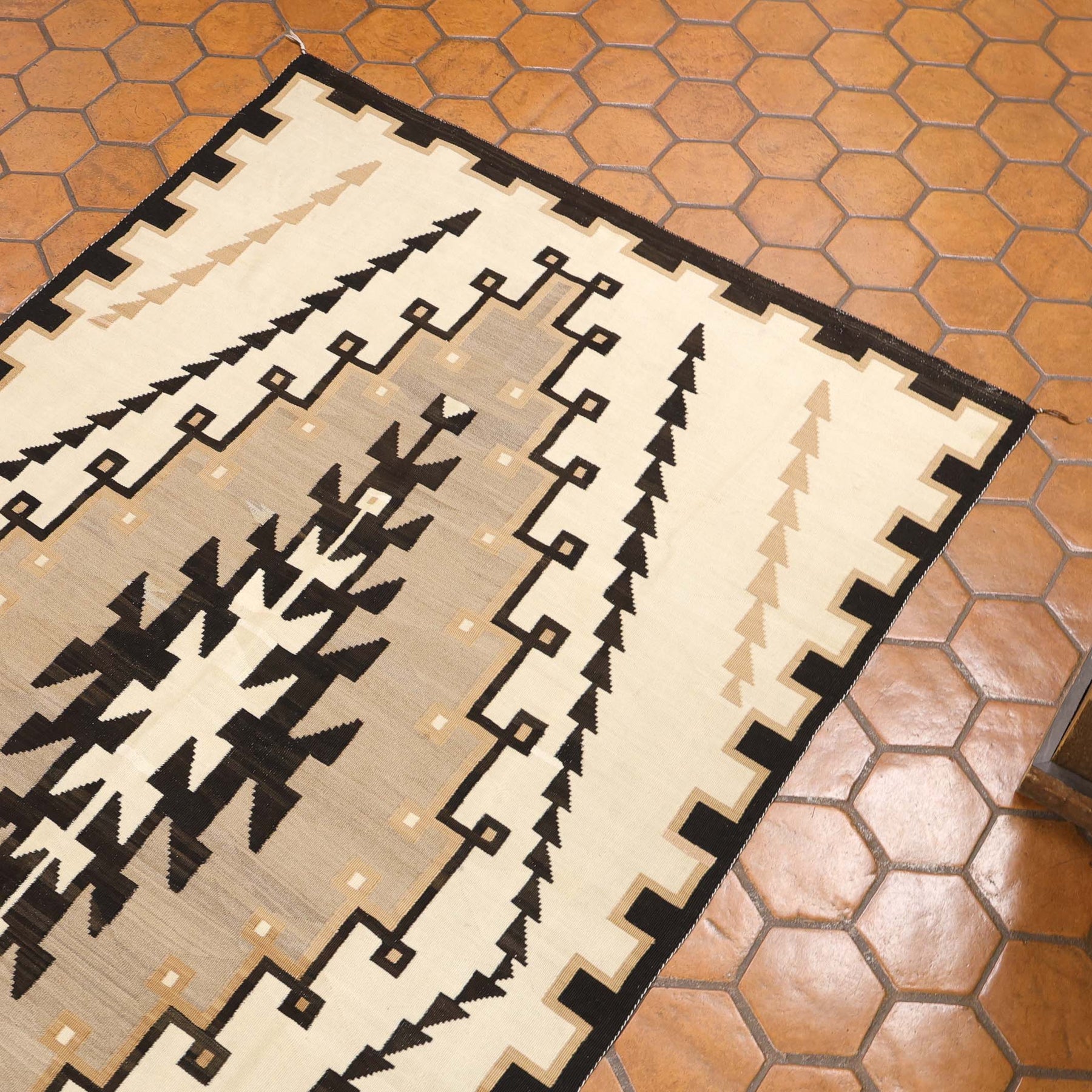 Handwoven 1930s Navajo Weaving in the Two Grey Hills Regional Style with Hand-Carded and Spun Wool. This weaving has reweave repairs and has been priced accordingly.