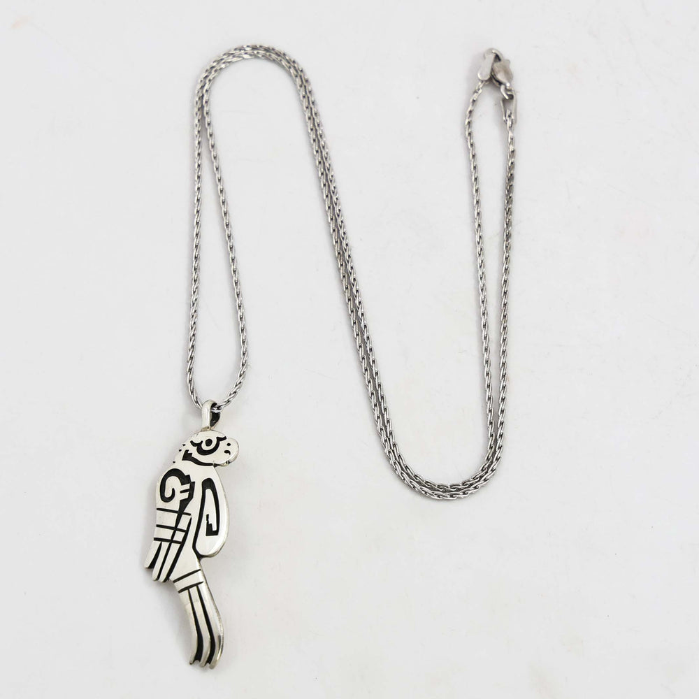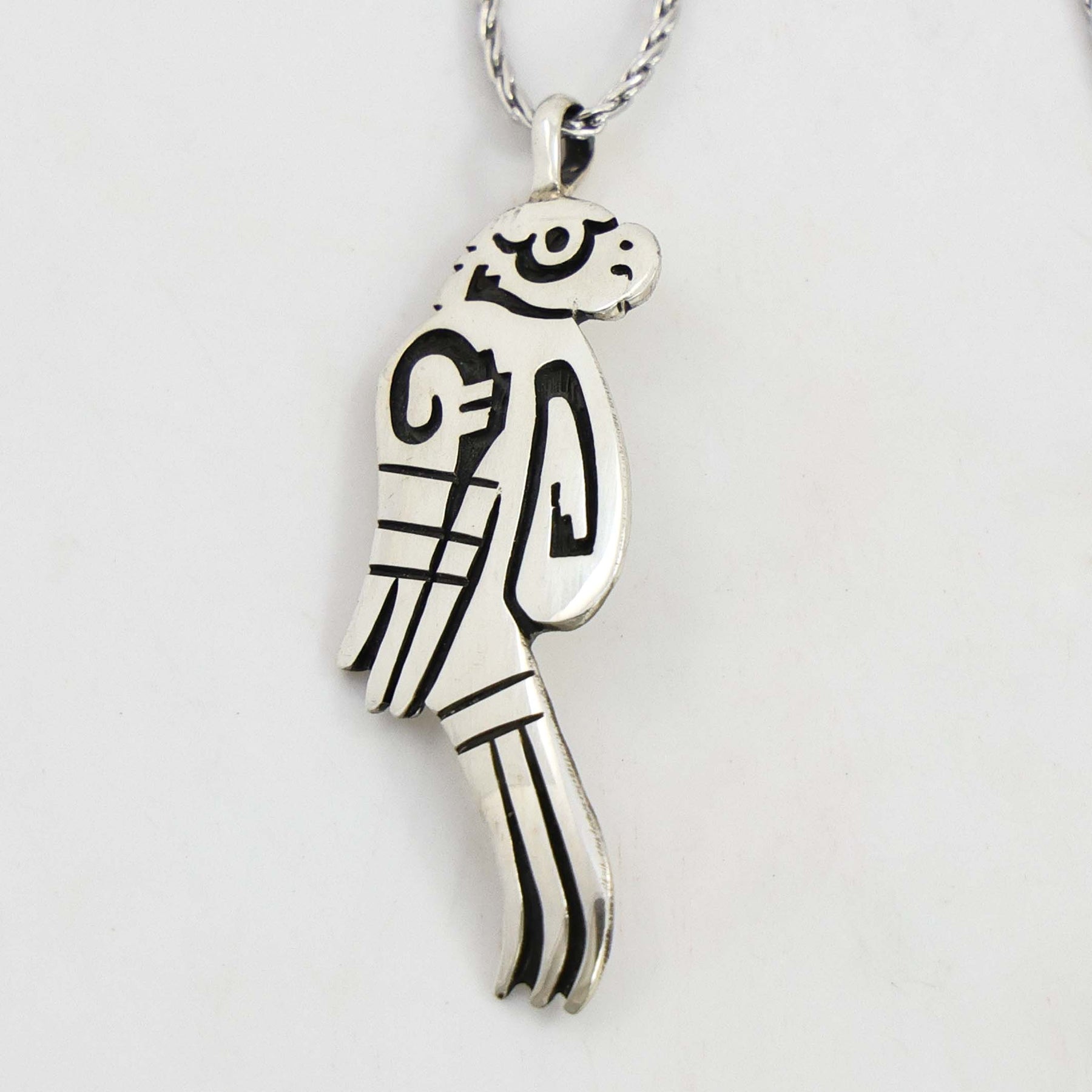 Sterling Silver Parrot Pendant with Hopi Overlaid Cloud and Rain Symbols on a 20” sterling silver braided chain.