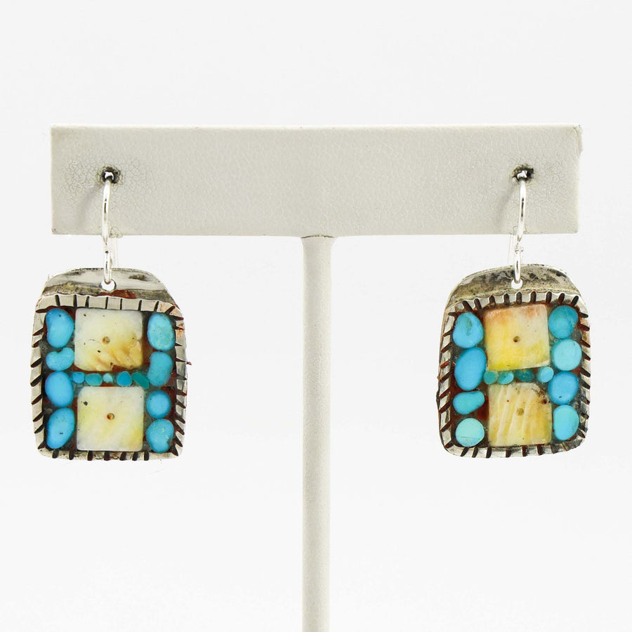 Sterling Silver French Hook Earrings with Mosaic Inlaid Turquoise and Spiny Oyster Shell.