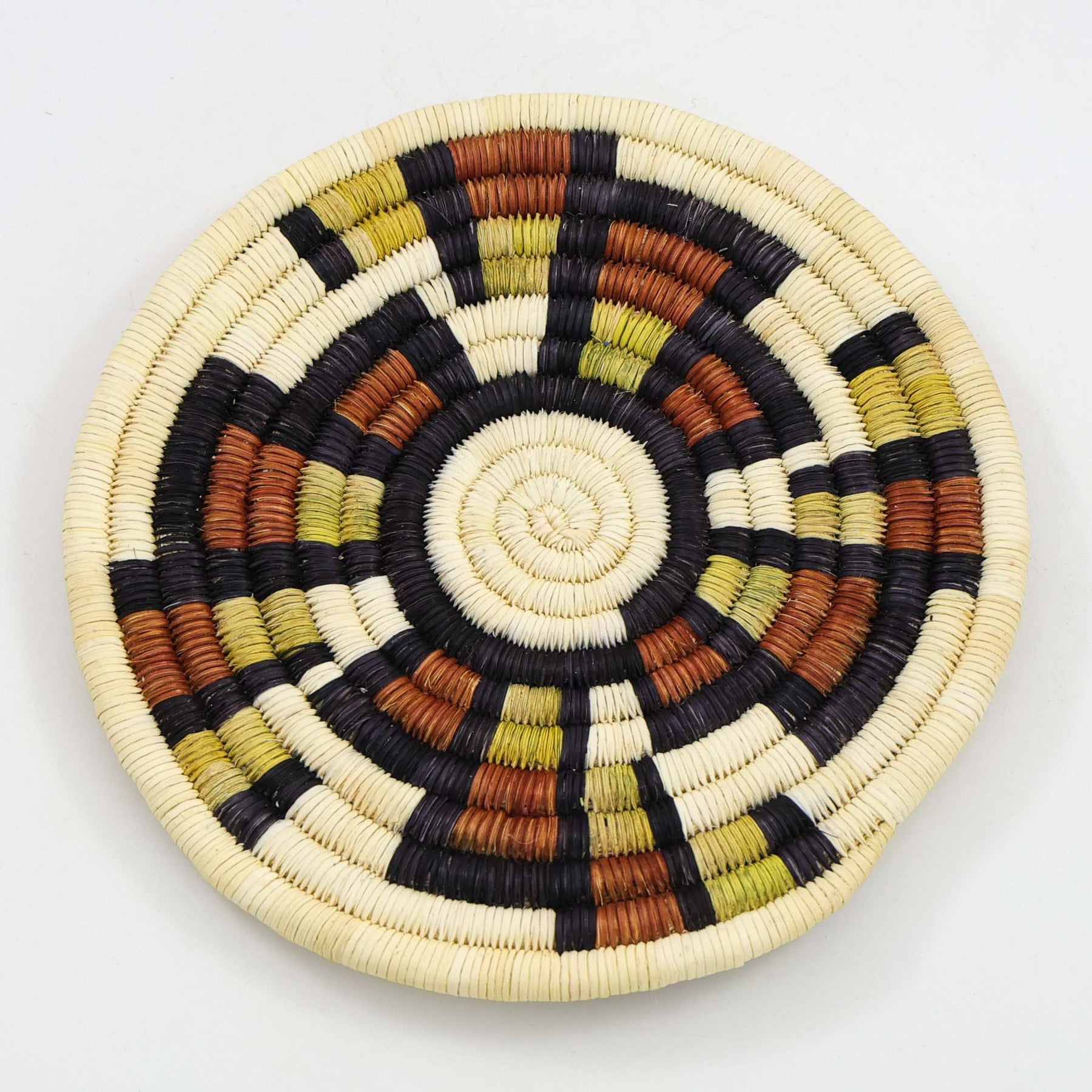 Hand-coiled Hopi yucca and beargrass basketry plaque, featuring natural dyes to create whirling cloud designs, symbolizing the vital forces of wind, rain, and storms essential for agriculture, embodying prayers for moisture, fertility, and the dynamic movement of weather that brings life to the arid Southwest.