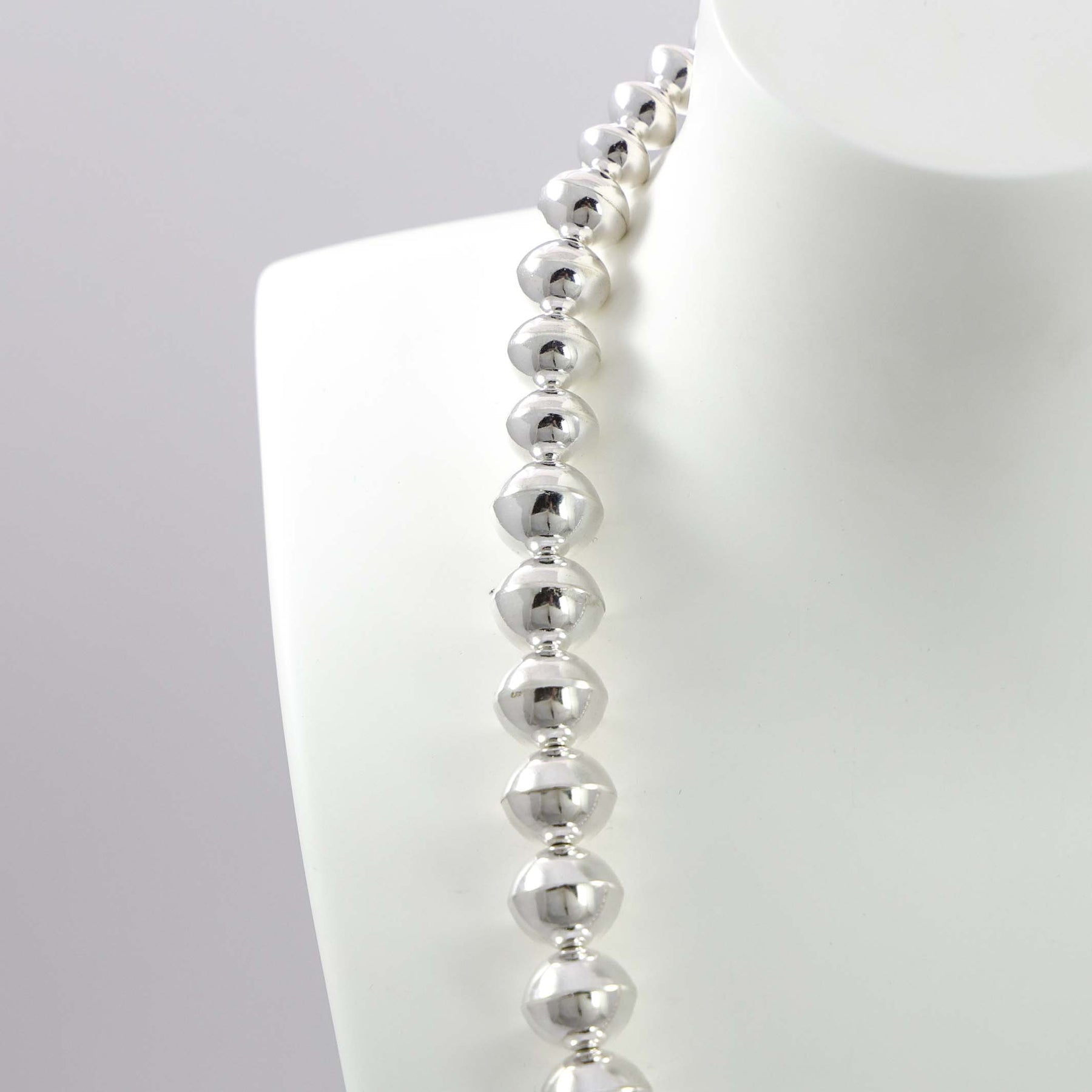 Sterling Silver Navajo Pearl Necklace with Handmade Beads in a High Polish Finish.