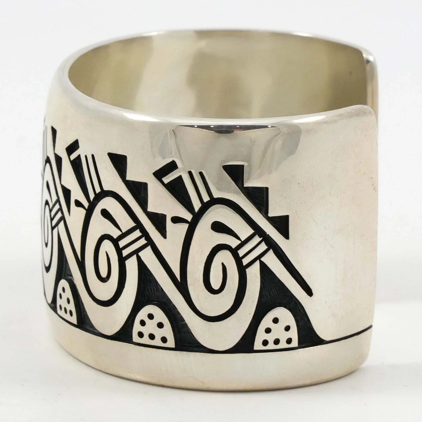 オーバーレイとは、デザインが切り出された銀片 (ネガ デザイン) を、2 番目の銀または金片の上に置き、はんだ付けしたものを表します。まず、アーティストは銀から慎重にデザインを切り取り、残りの部分を保持します。デザインは慎重に切断する必要があり、これはプロセス全体で最も骨の折れる複雑なステップになります。この銀片は無地の銀のシートにはんだ付けされ、デザインの内側 (カットアウト領域) が酸化されて、磨かれた銀層の下に黒が現れます。