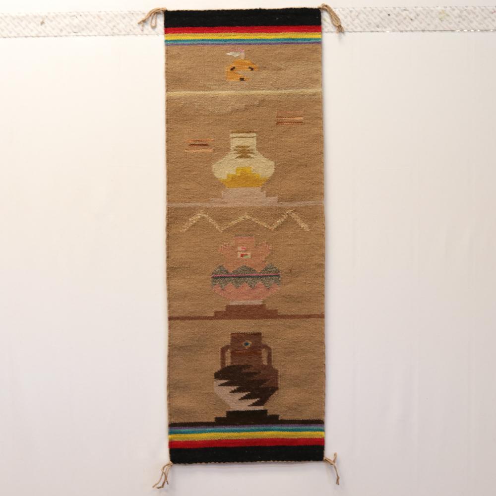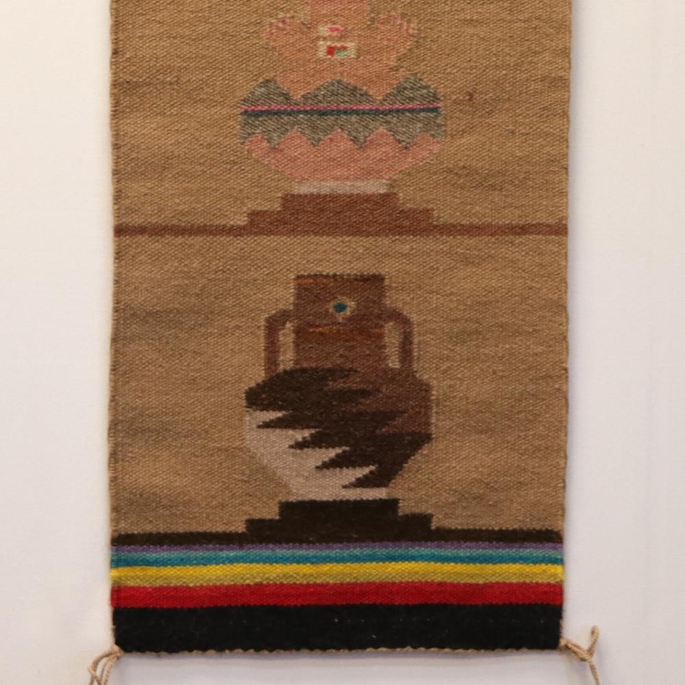 月と陶器を描いたパネルを備えた、マーガレット・コーディによる絵画的なランナー織り。マーガレット自身の羊からハンドカードとハンドスパンウールで作られています。