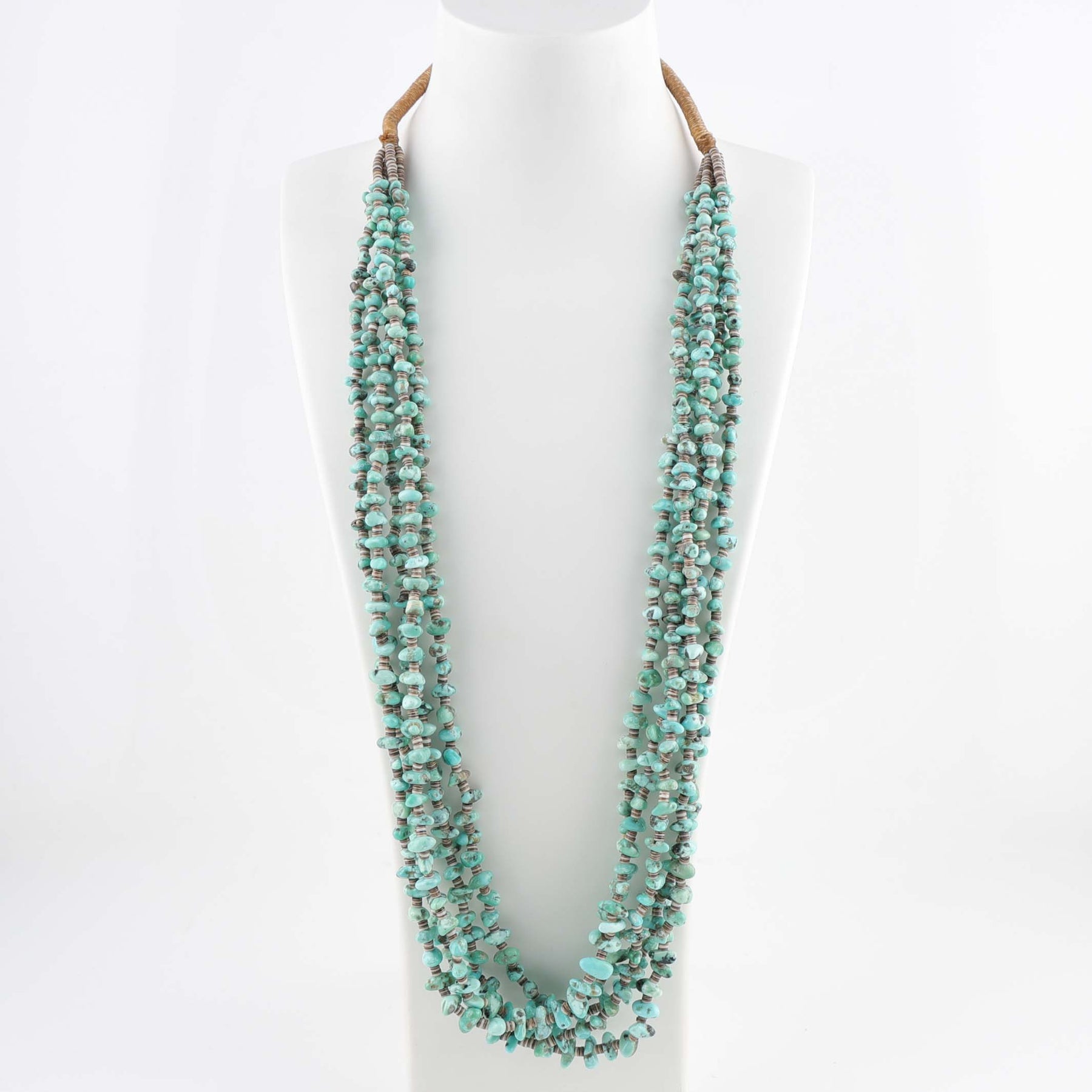 Five-Strand Necklace with Stabilized Kingman Turquoise Nugget Beads and Heishi Spacer Beads. The necklace is finished with a traditional wrapped backing.