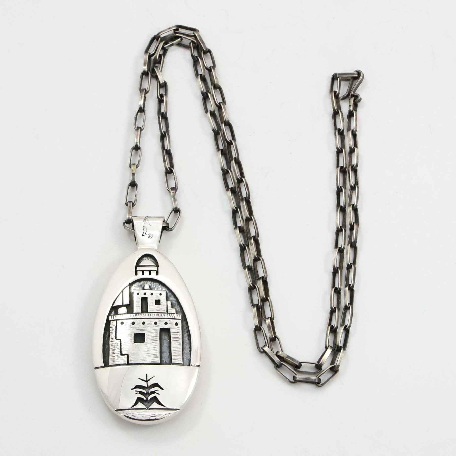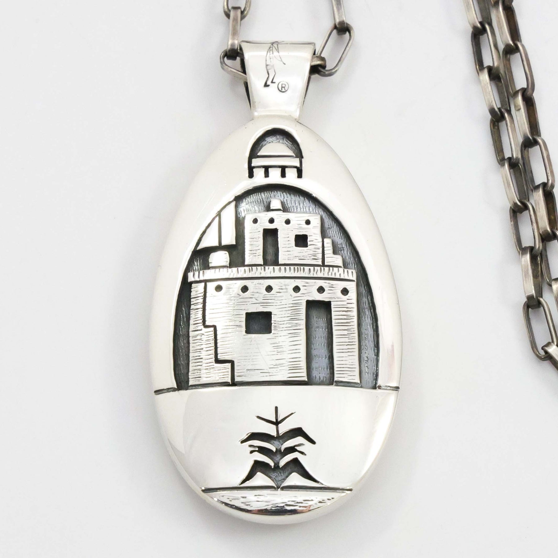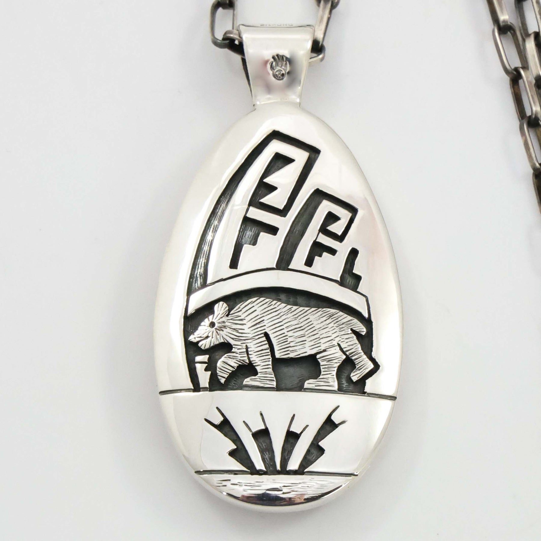 Sterling silver reversible overlay pendant featuring two classic Hopi designs by silversmith Ricky Coochwytewa. One side shows a traditional Hopi pueblo village with stepped architecture, a rain cloud above, and a sprouting corn stalk below, symbolizing home, growth, and the blessings of sustenance. The reverse depicts a bear—an important guardian and healing figure in Hopi culture—set beneath rain and cloud motifs, with prayer feathers (pahos) at the bottom. The pendant is on a 24“ handmade sterling silver Hopi link chain.