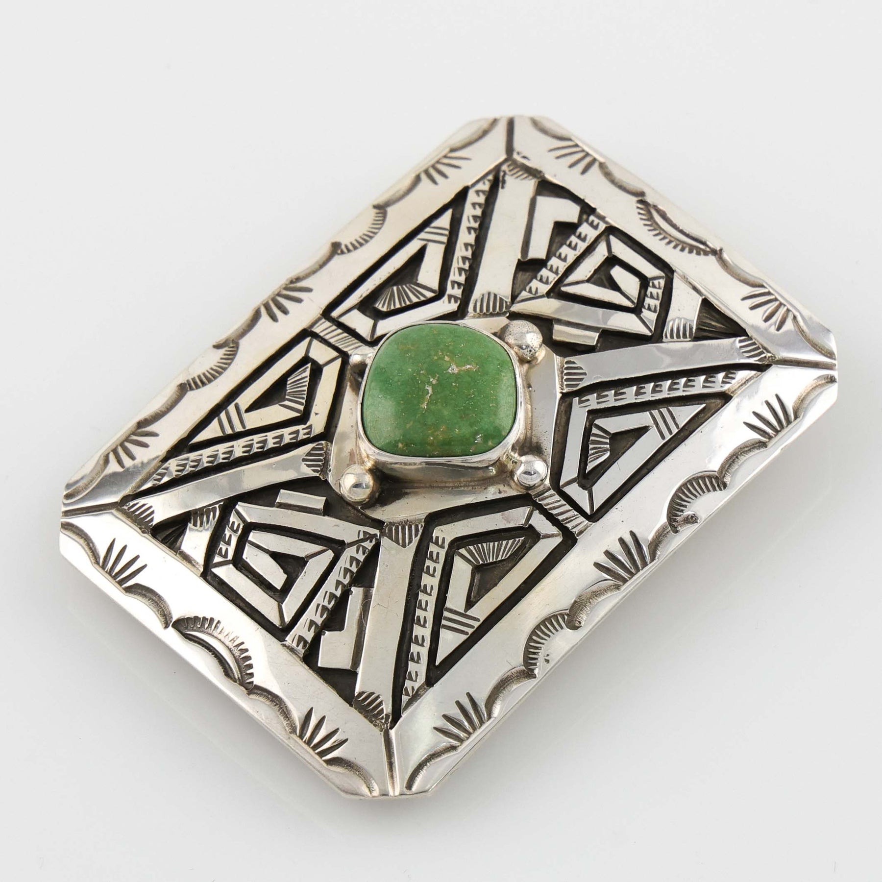 Sterling Silver Western Style Belt Buckle with Overlaid Designs and set with Natural Royston Turquoise.