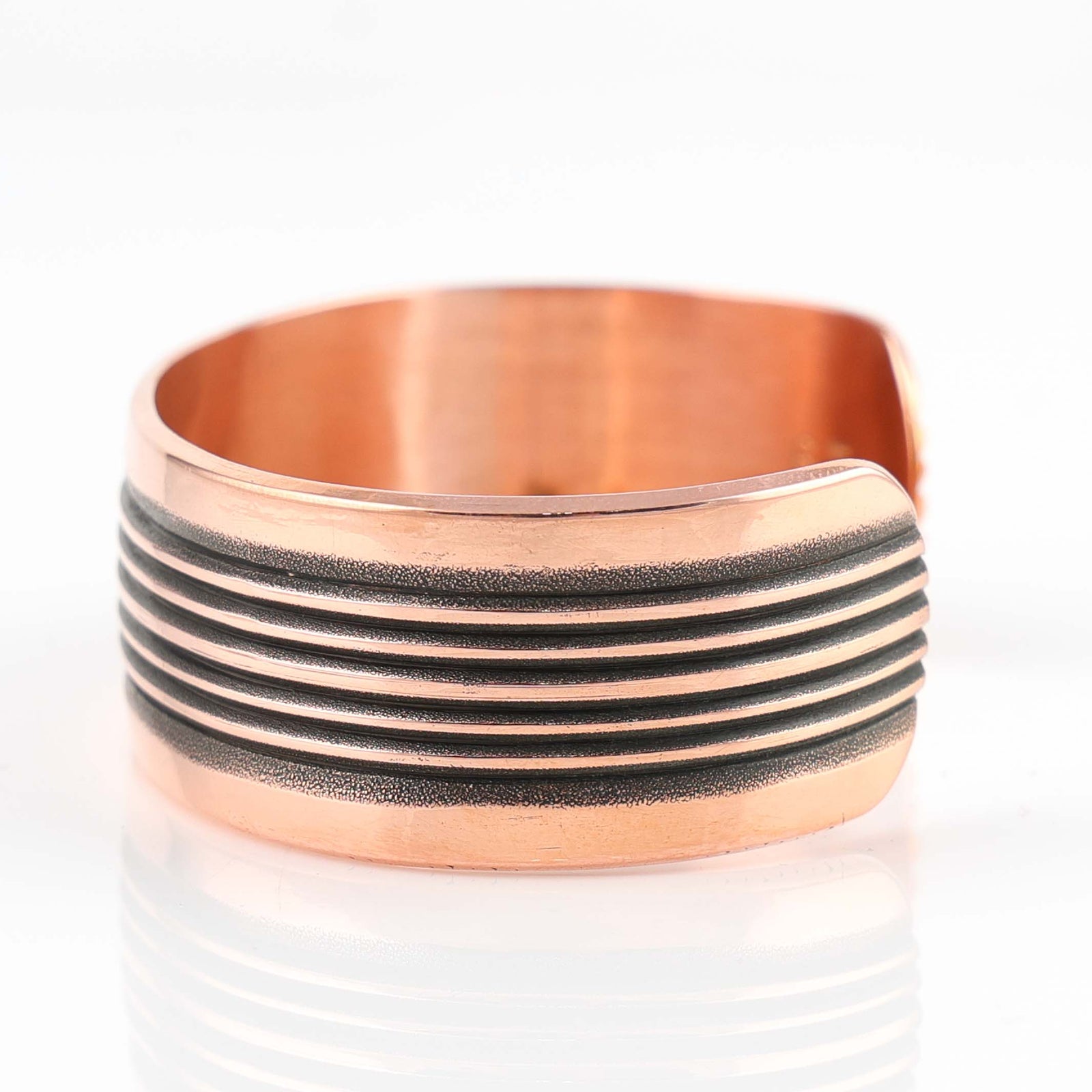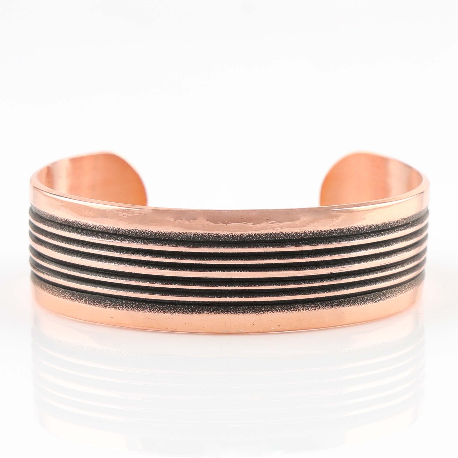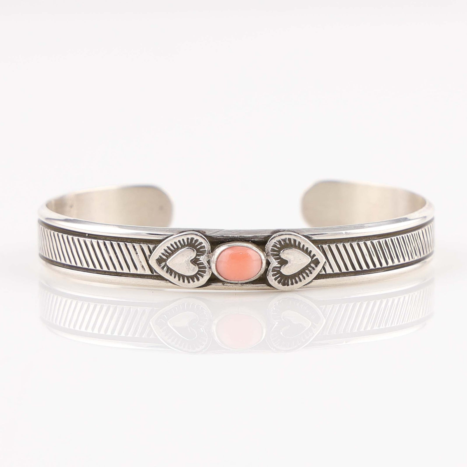 ブレスレットは、おそらく南西部のジュエリーの中で最も認知度の高い形です。デザインの多様性で人気があり、カフス、リンク ブレスレット、バングルの 3 つの主要な形のブレスレットが見られます。カフスは、アメリカ南西部のネイティブ アメリカンの銀細工師にとって最も伝統的なタイプのブレスレットです。カフは、開口部から手首に滑り込ませる硬い金属製のブレスレットです。リンク ブレスレットは手首を取り囲み、クラスプで留められます。バングルは、手の上に滑り込ませて手首にゆるく着用する、硬いフルサークルのブレスレットです。当初、ブレスレットはすべてシルバー、キャスト、または手でハンマーで成形されていました。 1880年代までに、ターコイズをシルバーにセットする技術が導入され、ブレスレットのデザインは永遠に変化しました.
