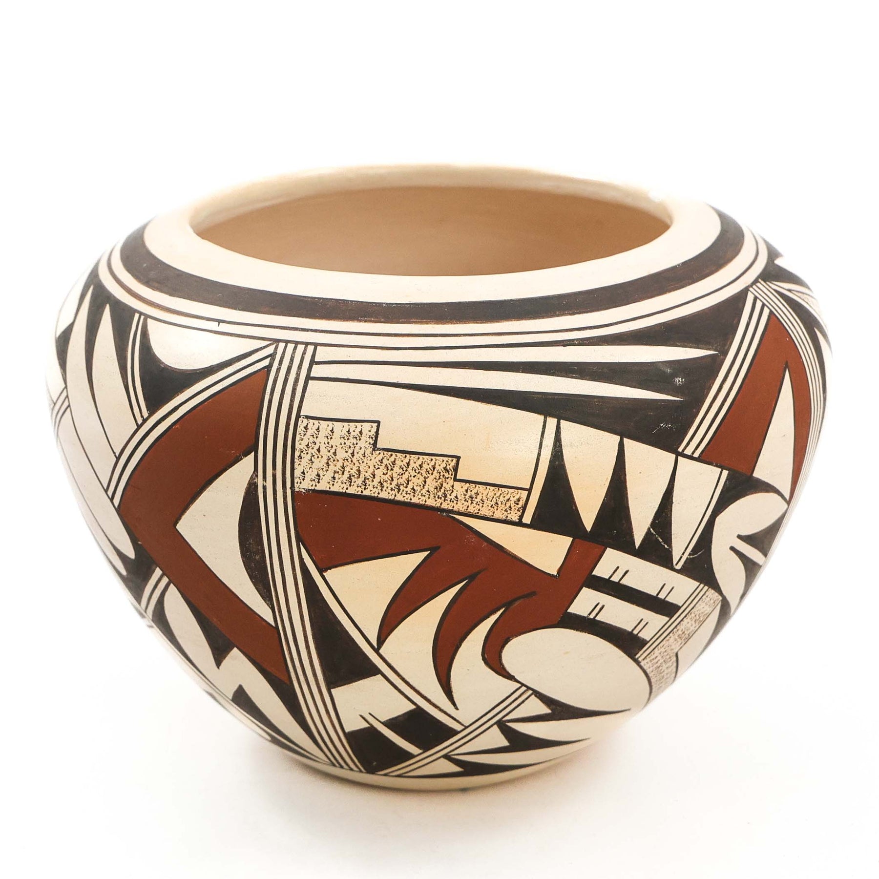 1980s Hand-Coiled and Traditionally Fired Hopi Jar with Hand-Painted Polychrome Designs by acclaimed Hopi-Tewa potter, Joy Navasie “Frog Woman” (1919-2012).