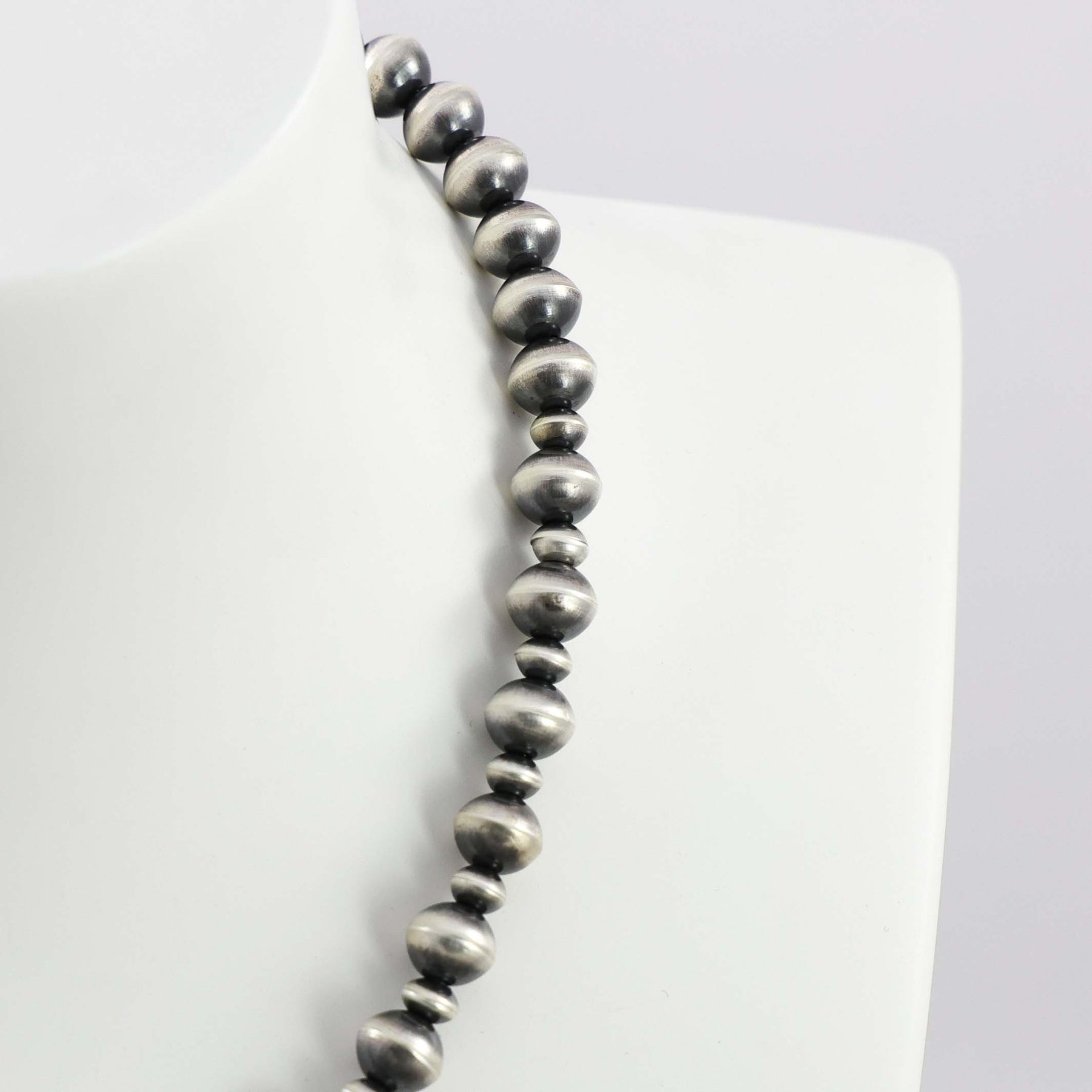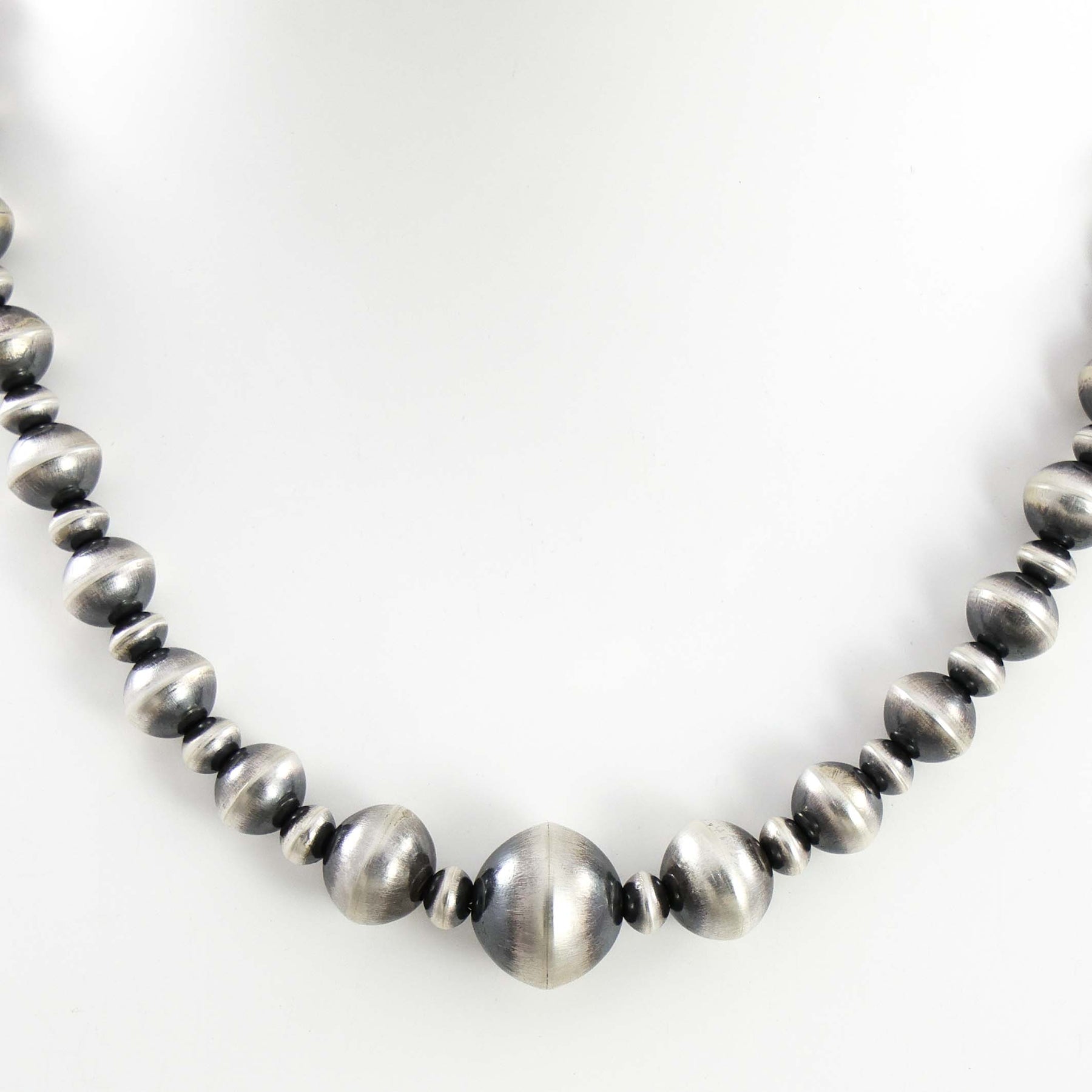Sterling Silver Navajo Pearl Necklace with Alternating Handmade Beads in an Oxidized Finish.
