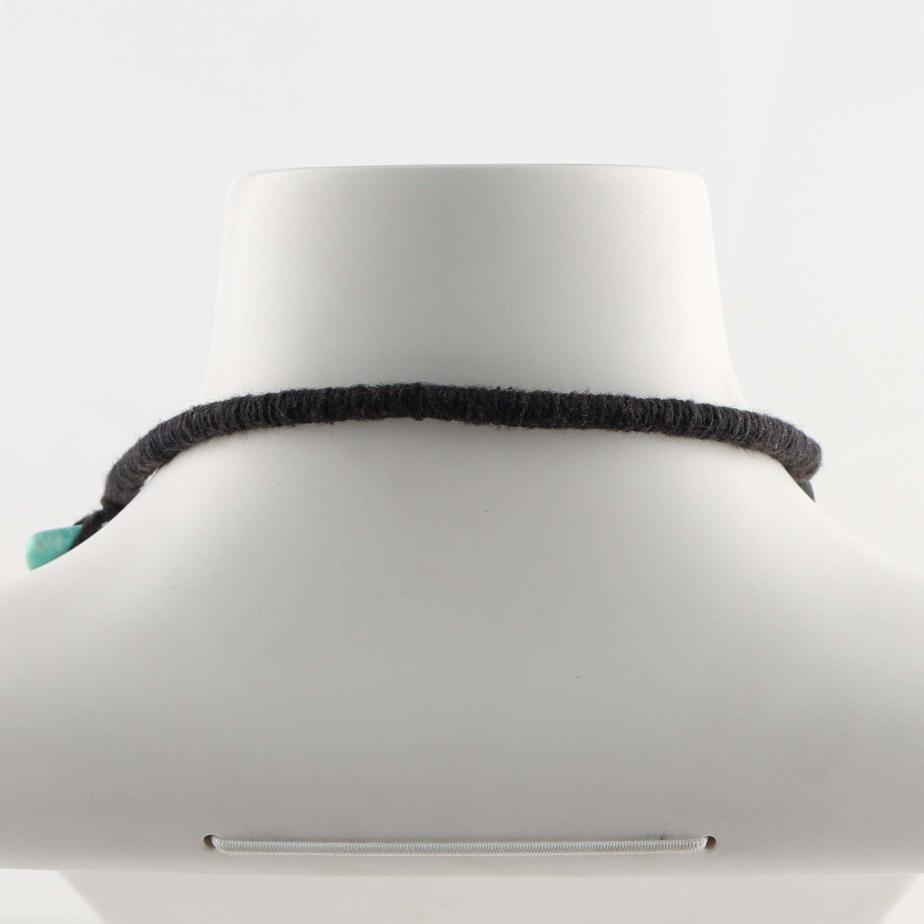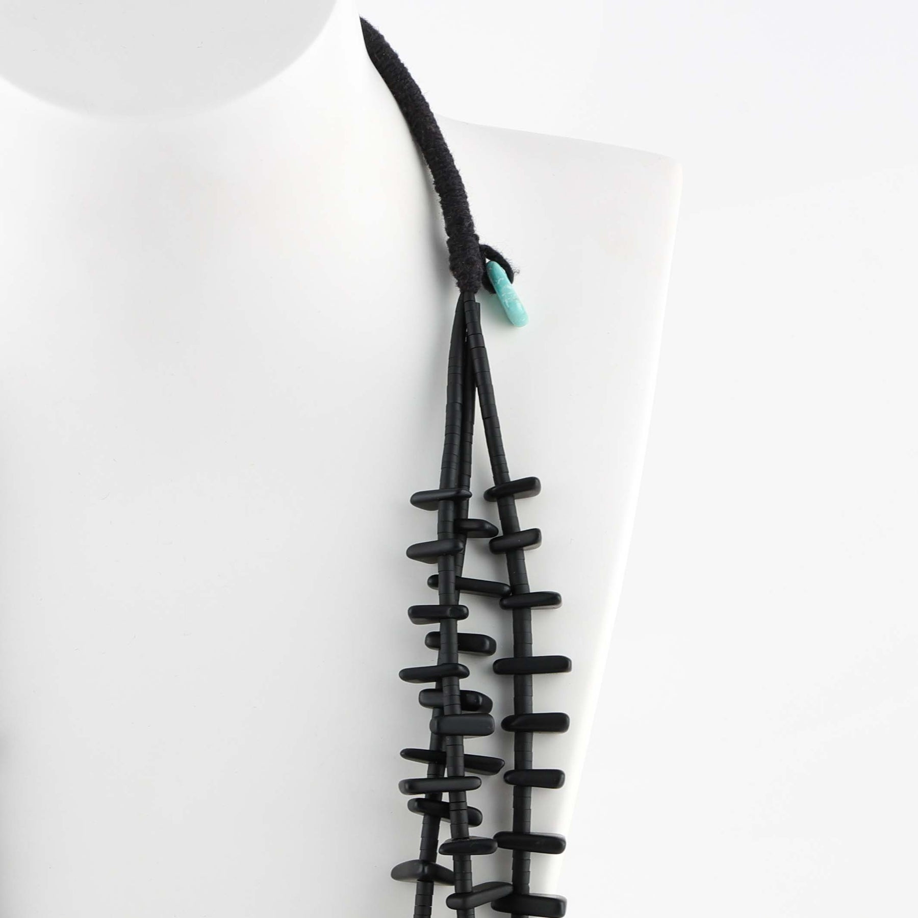 Three Strand Necklace with Hand-Rolled Jet Beads, Tabs, and Jaclas. This necklace has a traditional wrapped backing and a signature Natural Sleeping Beauty Turquoise tab.