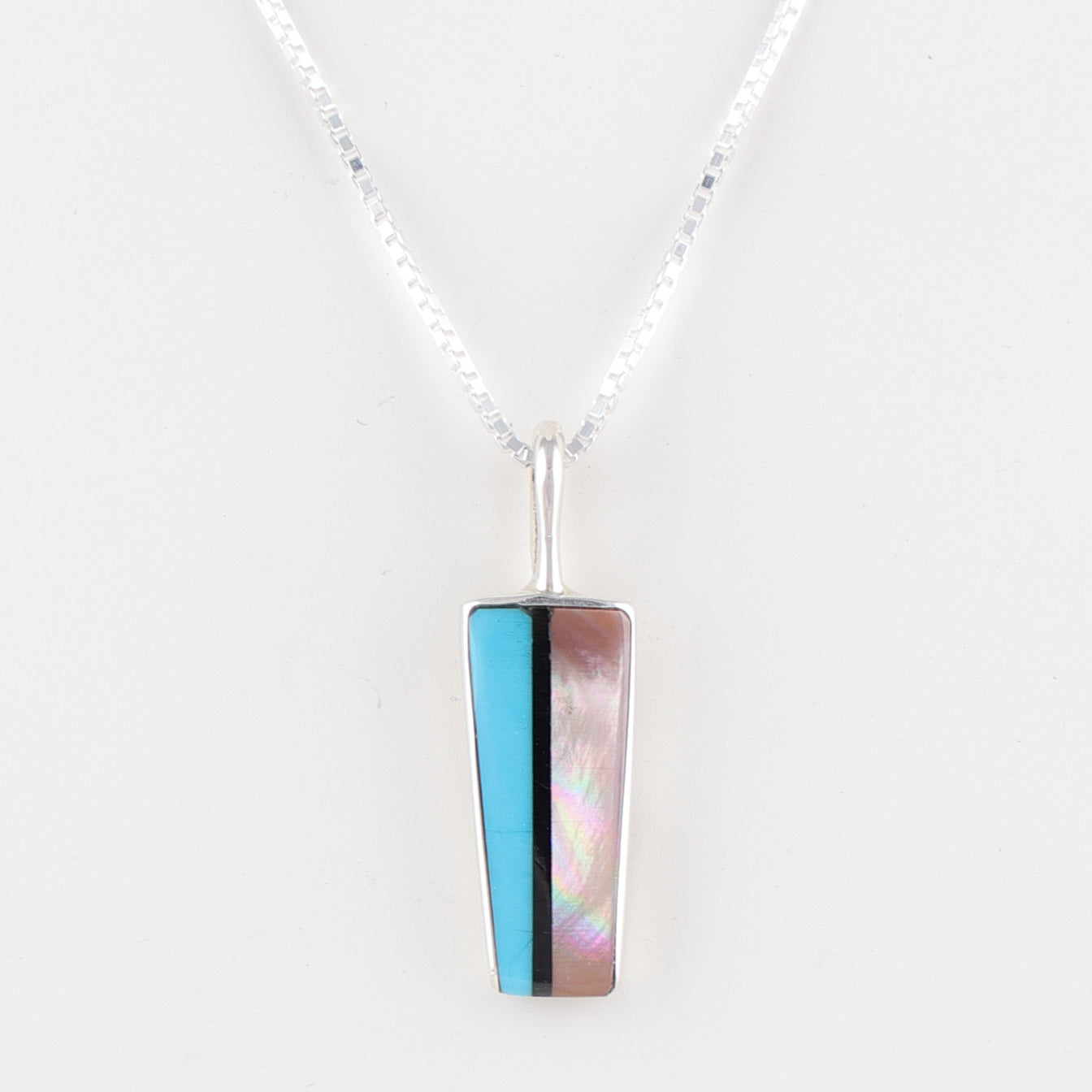 Sterling Silver Pendant featuring Mosaic Inlaid Turquoise, Black Jet, and Mother of Pearl on an 18” Sterling Silver Chain by Navajo Silversmith, Jimmy Poyer.