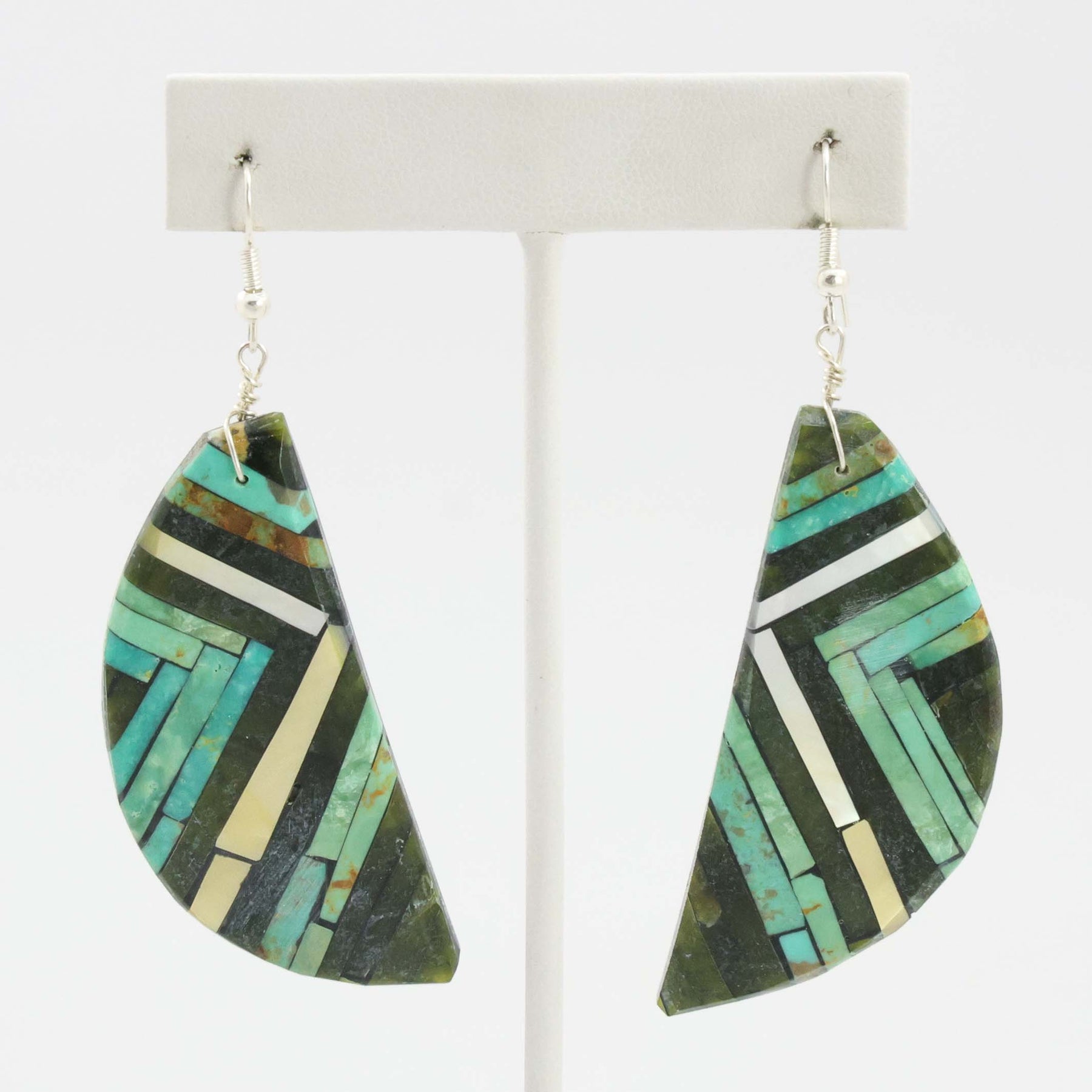Sterling Silver French Hook Dangle Earrings with Mosaic Inlaid Kingman Turquoise, Mother of Pearl Shell, and Serpentine on a Shell Backing.
