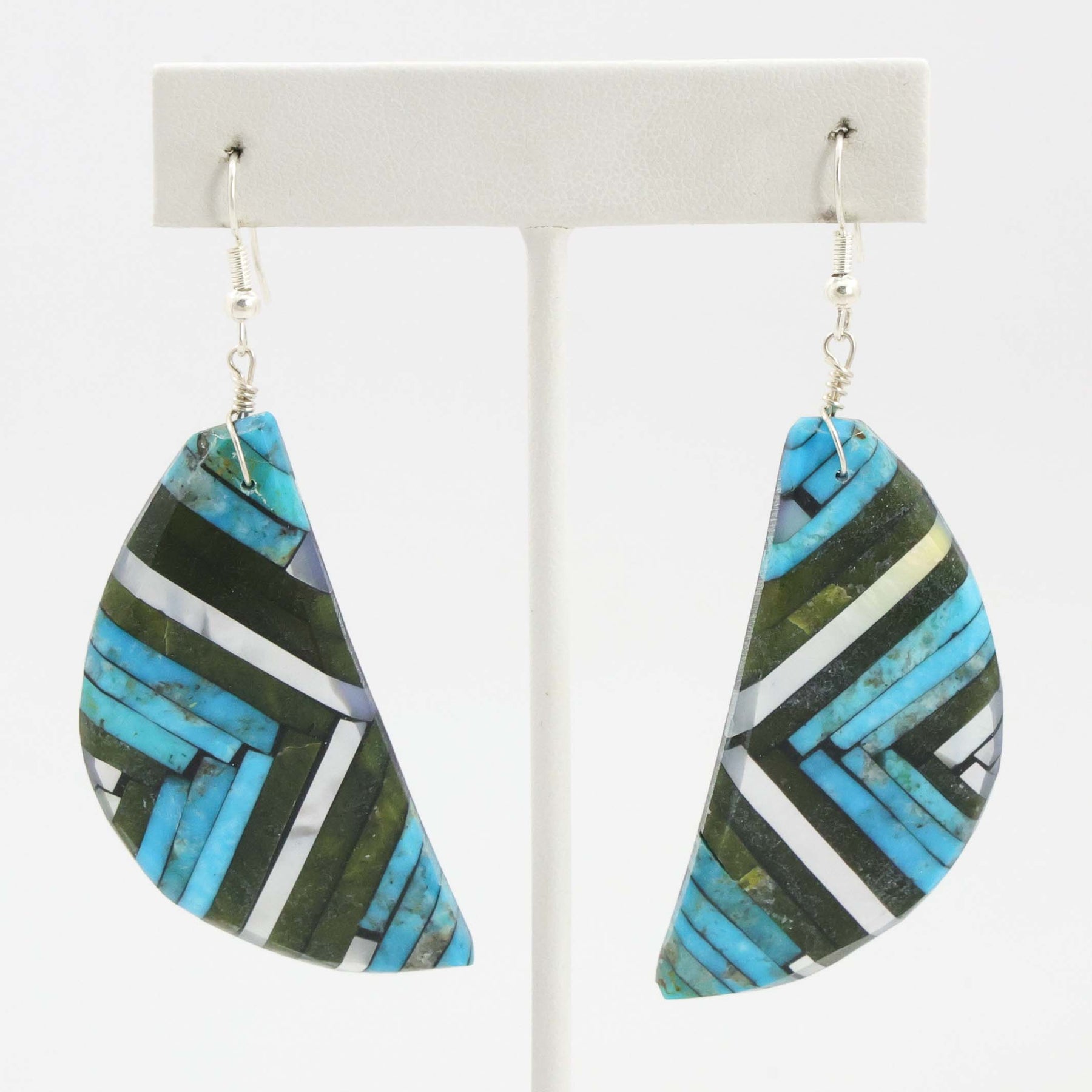 Sterling Silver French Hook Dangle Earrings with Mosaic Inlaid Kingman Turquoise, Serpentine, and Mother of Pearl Shell on a Shell Backing.