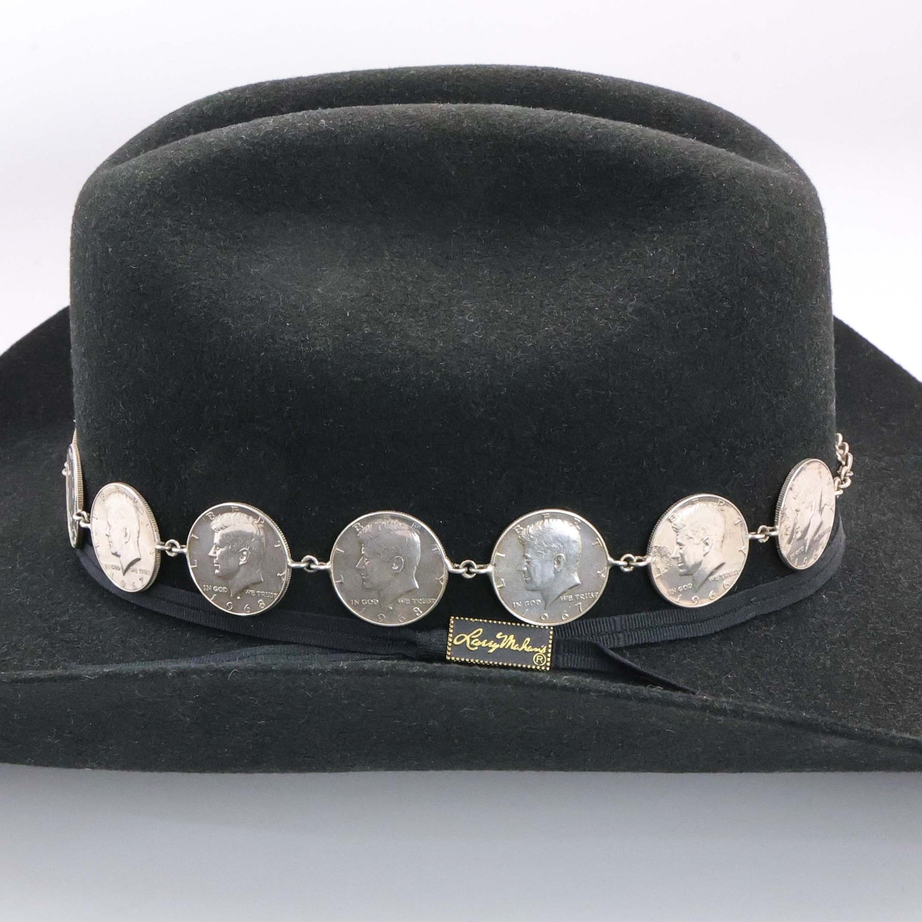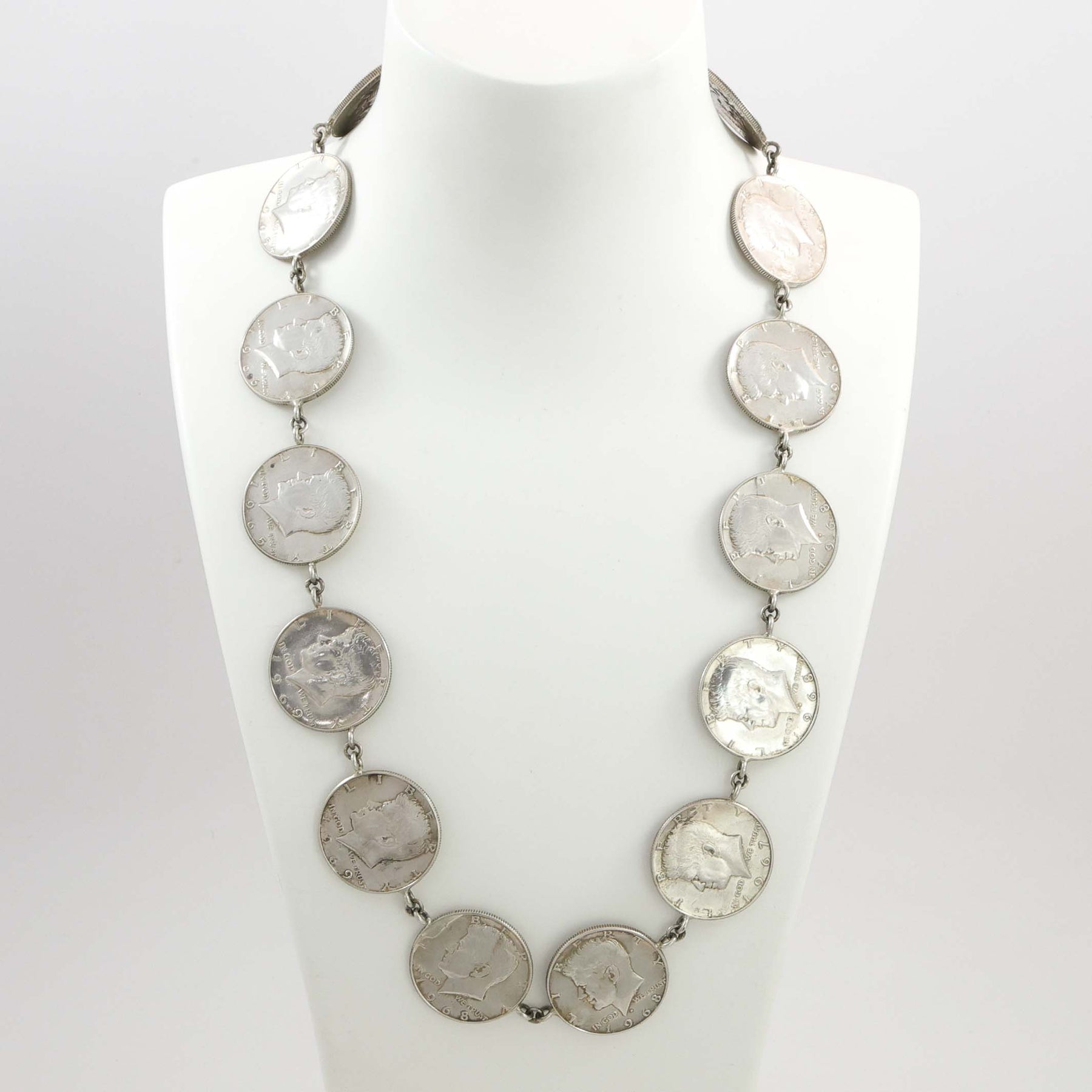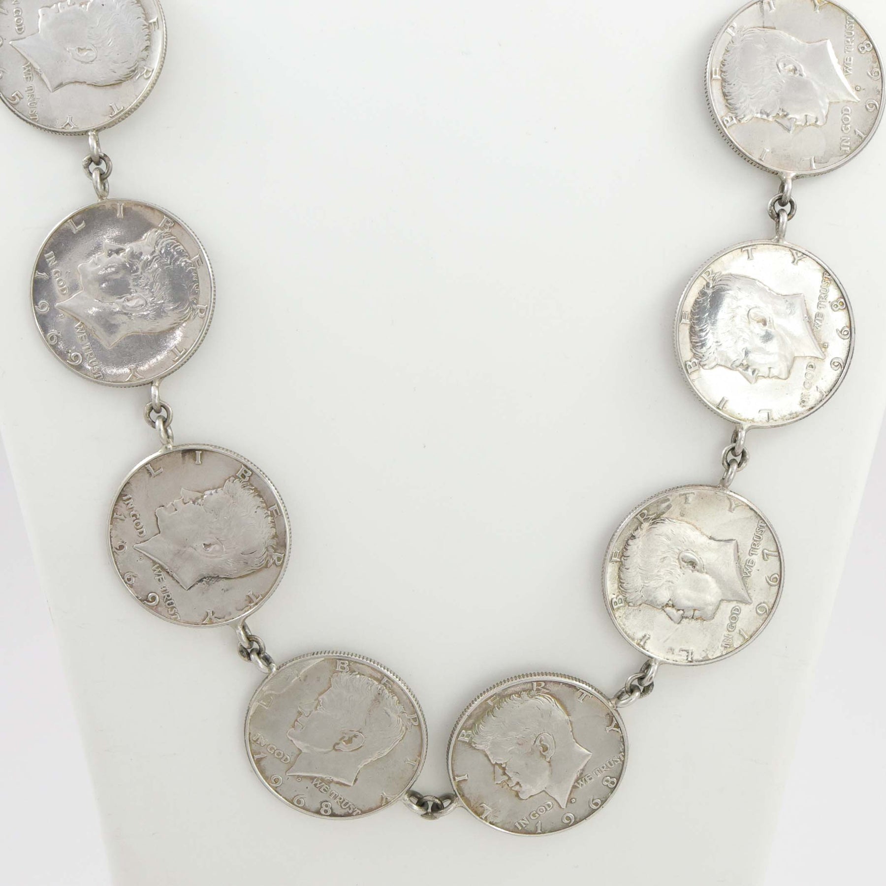 This Vintage Coin-Themed Piece can be Enjoyed either as a Necklace or Hatband (See photos). This piece is composed of fourteen Kennedy half dollars connected by silver links with silver findings at the ends. The coins are dated 1965 to 1969.