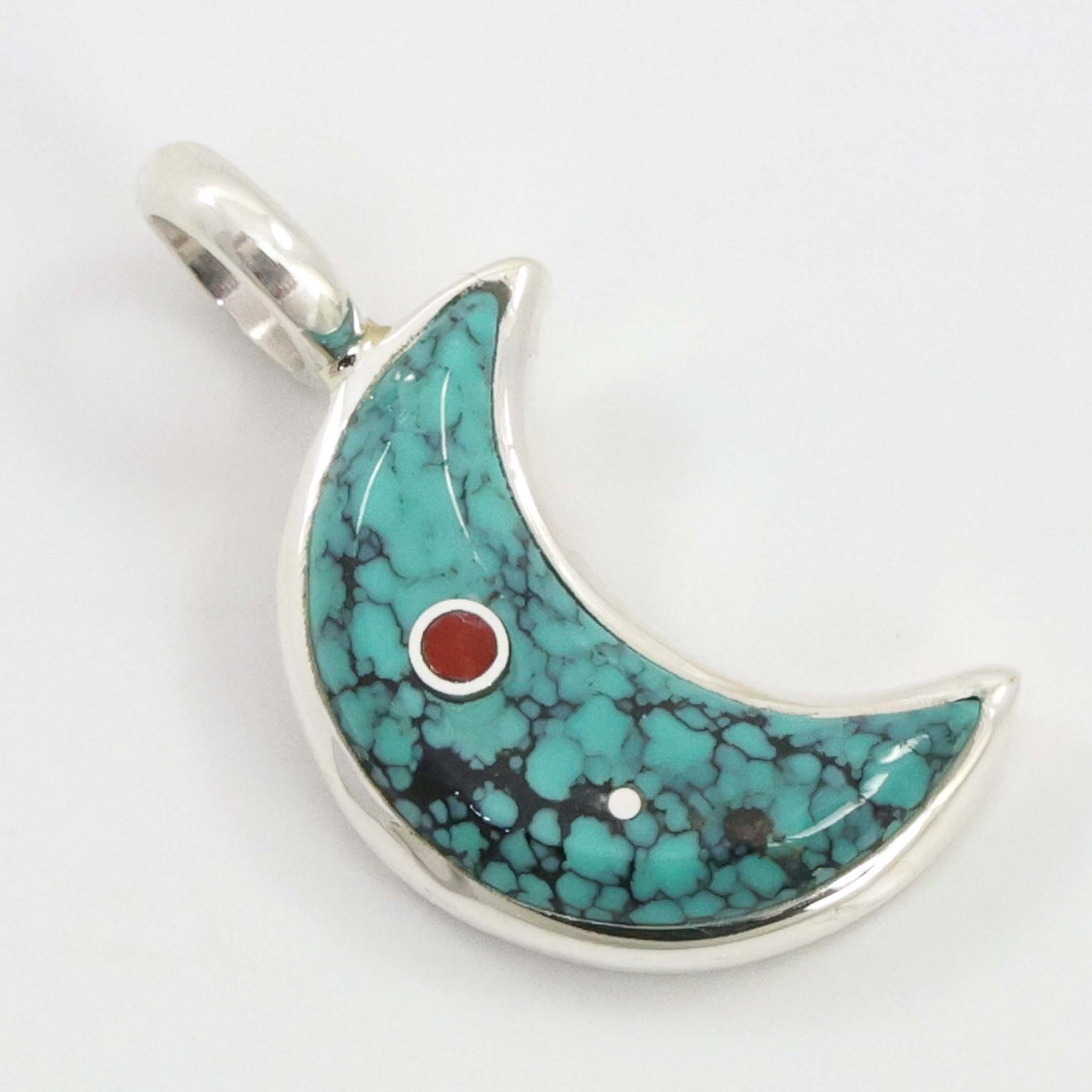 Sterling Silver Moon Pendant with Inlaid Turquoise and Mediterranean Coral.