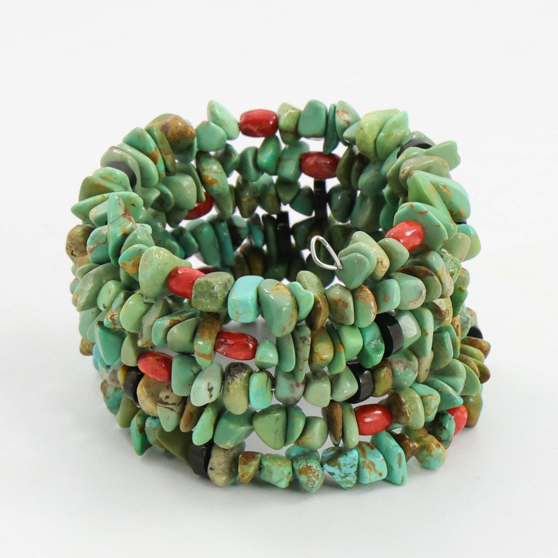 Wrap Bead Bracelet with Turquoise, Jet, and Apple Coral Nugget Beads. This bracelet is adjustable and can wrap around most wrists.