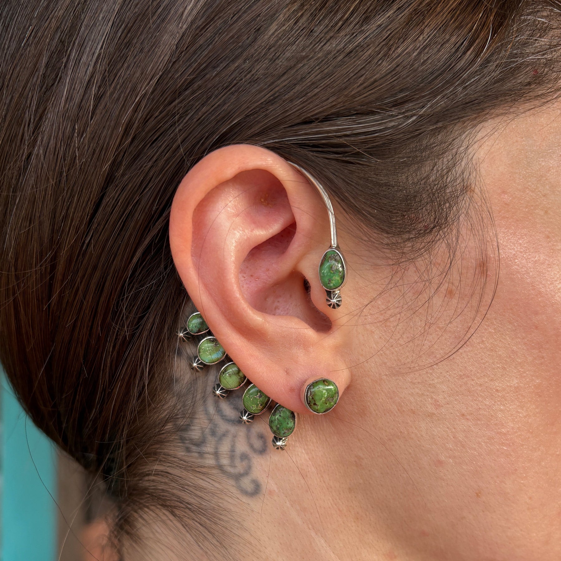 Sterling Silver Post Earrings and Matching Sterling Silver Ear Cuffs set with Natural Sonoran Gold Turquoise from Mexico.