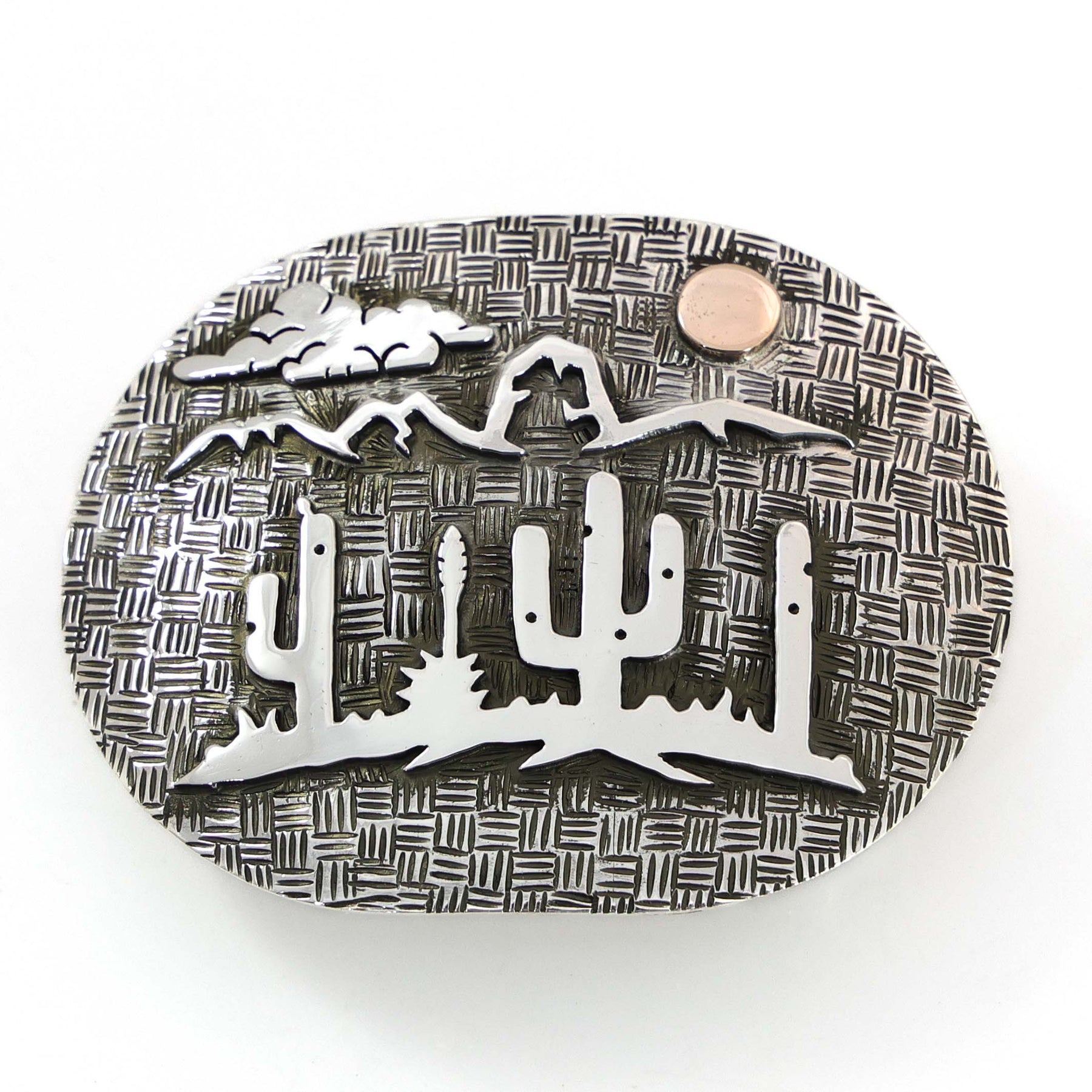 Sterling Silver Western Style Belt Buckle Featuring a Desert Scene with Cactus, Mountains, Clouds, and 14k Gold Sun.