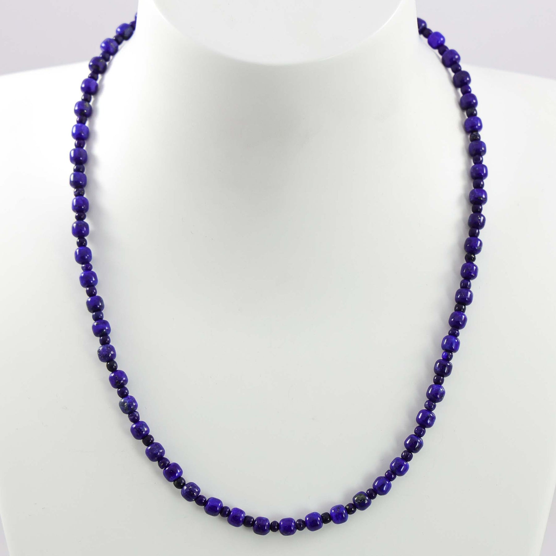 Single Strand Lapis Bead Necklace with a Sterling Silver Clasp.