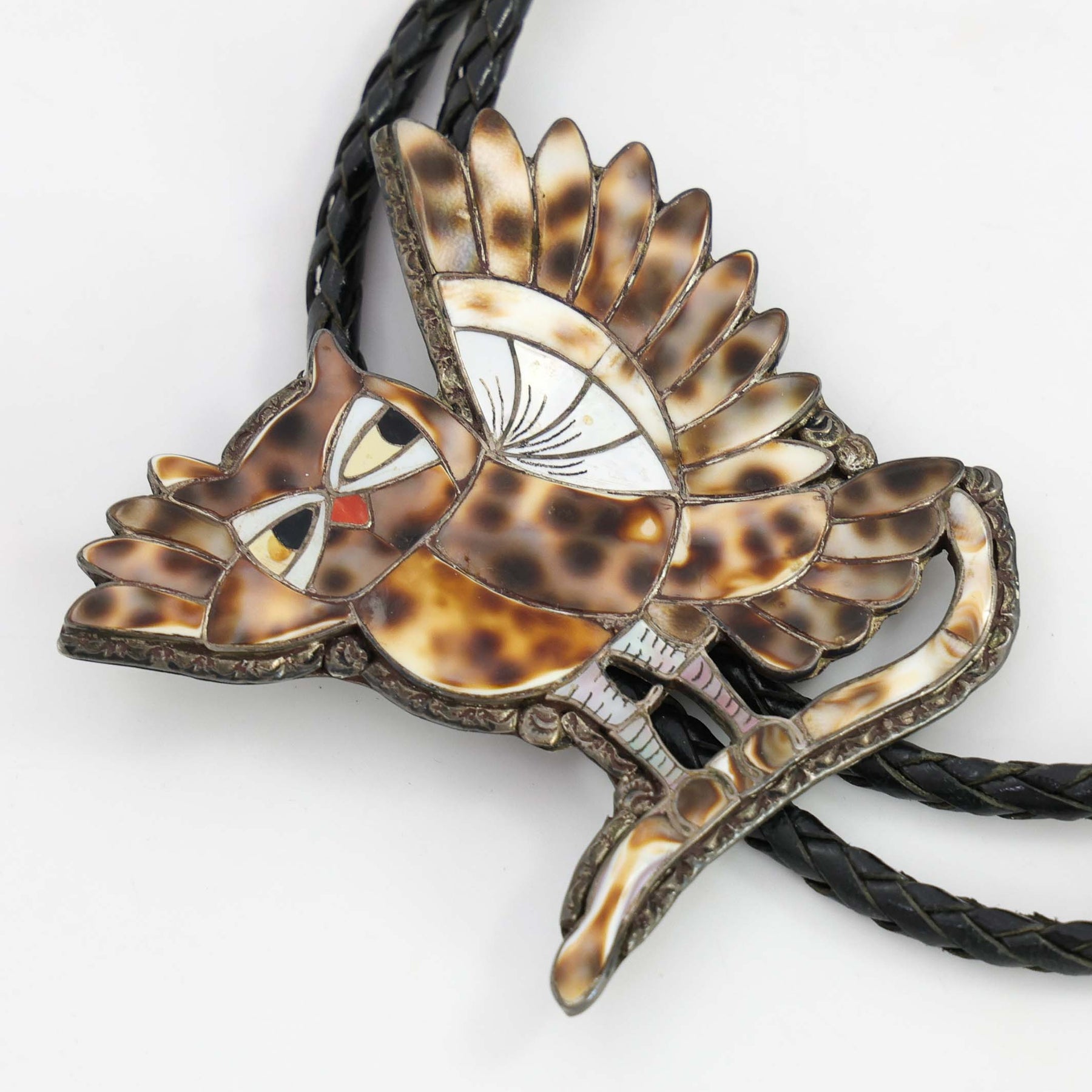 1960s Zuni Owl Bola Tie with Cobble Inlaid Cowrie Shell, Mother of Pearl Shell, Abalone Shell, Jet, and Mediterranean Coral. This bola tie features a clamp backing and handmade tips with inlaid Cowrie Shell and Turquoise.