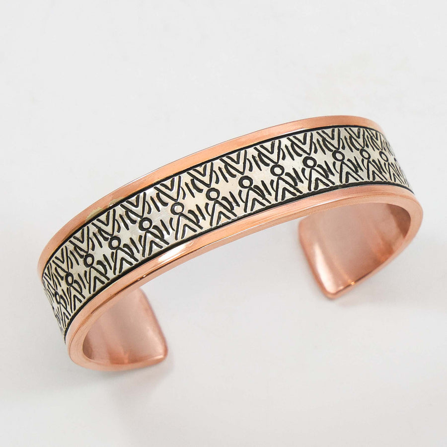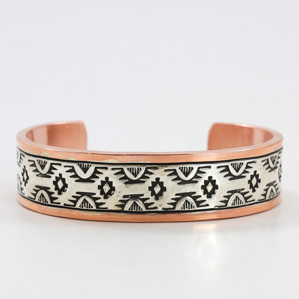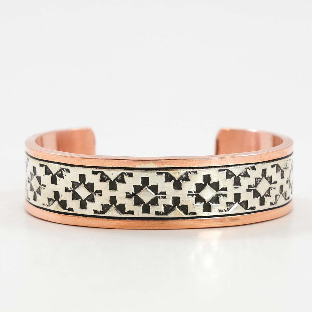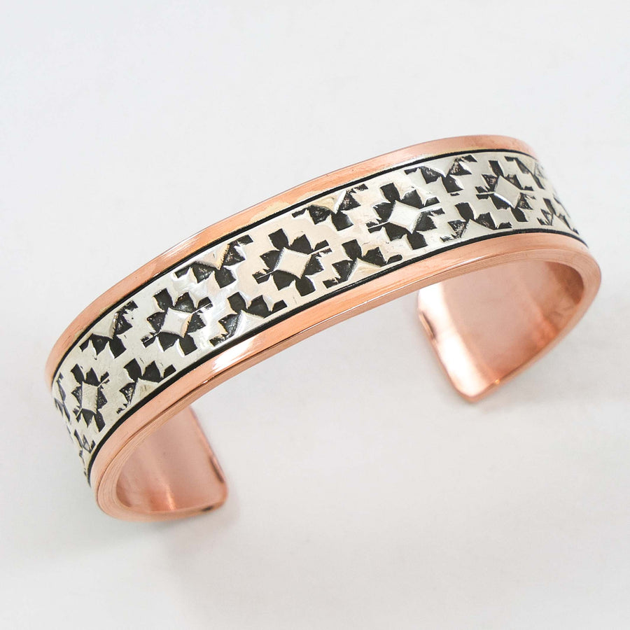 オーバーレイとは、デザインが切り出された銀片 (ネガ デザイン) を、2 番目の銀または金片の上に置き、はんだ付けしたものを表します。まず、アーティストは銀から慎重にデザインを切り取り、残りの部分を保持します。デザインは慎重に切断する必要があり、これはプロセス全体で最も骨の折れる複雑なステップになります。この銀片は無地の銀のシートにはんだ付けされ、デザインの内側 (カットアウト領域) が酸化されて、磨かれた銀層の下に黒が現れます。