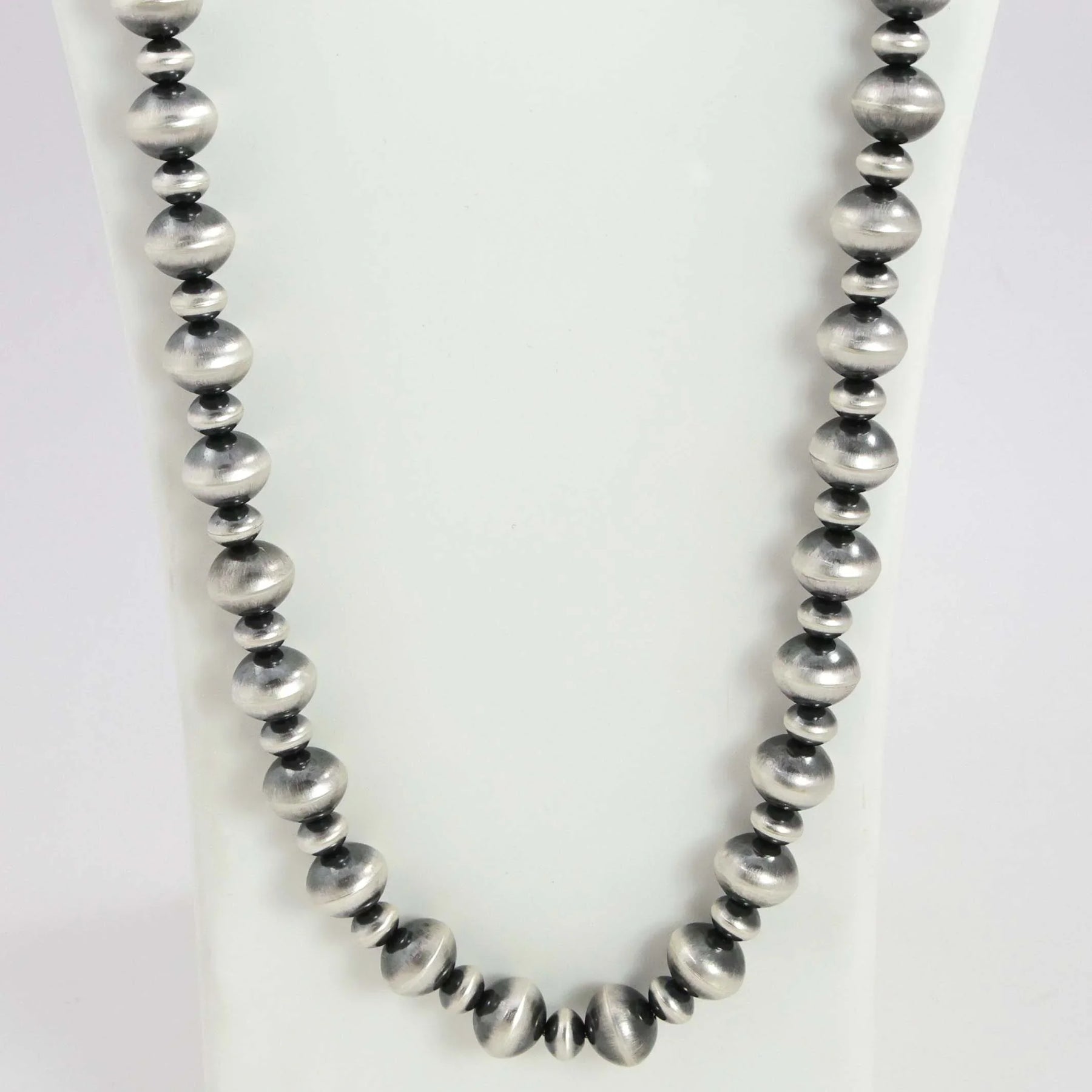 Single Strand Sterling Silver Navajo Pearl Necklace with Alternating Handmade Beads in an Oxidized Finish. This necklace can be wrapped twice to make a beautiful double strand necklace.