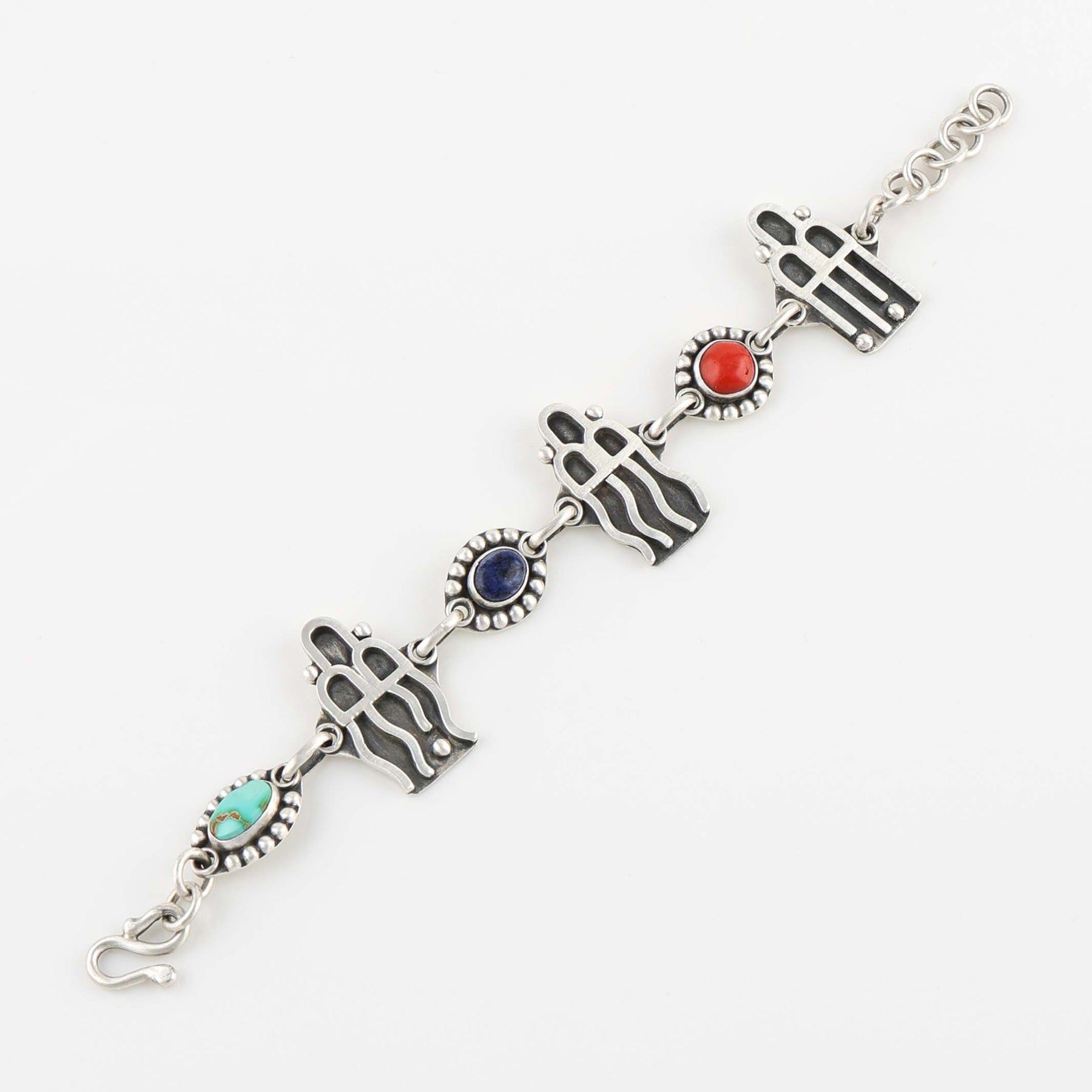 Sterling Silver Link Bracelet with Hand-cut and Hand-formed Applique Rain Cloud Designs and Charms set with Natural Royston Turquoise, Lapis, and Coral.