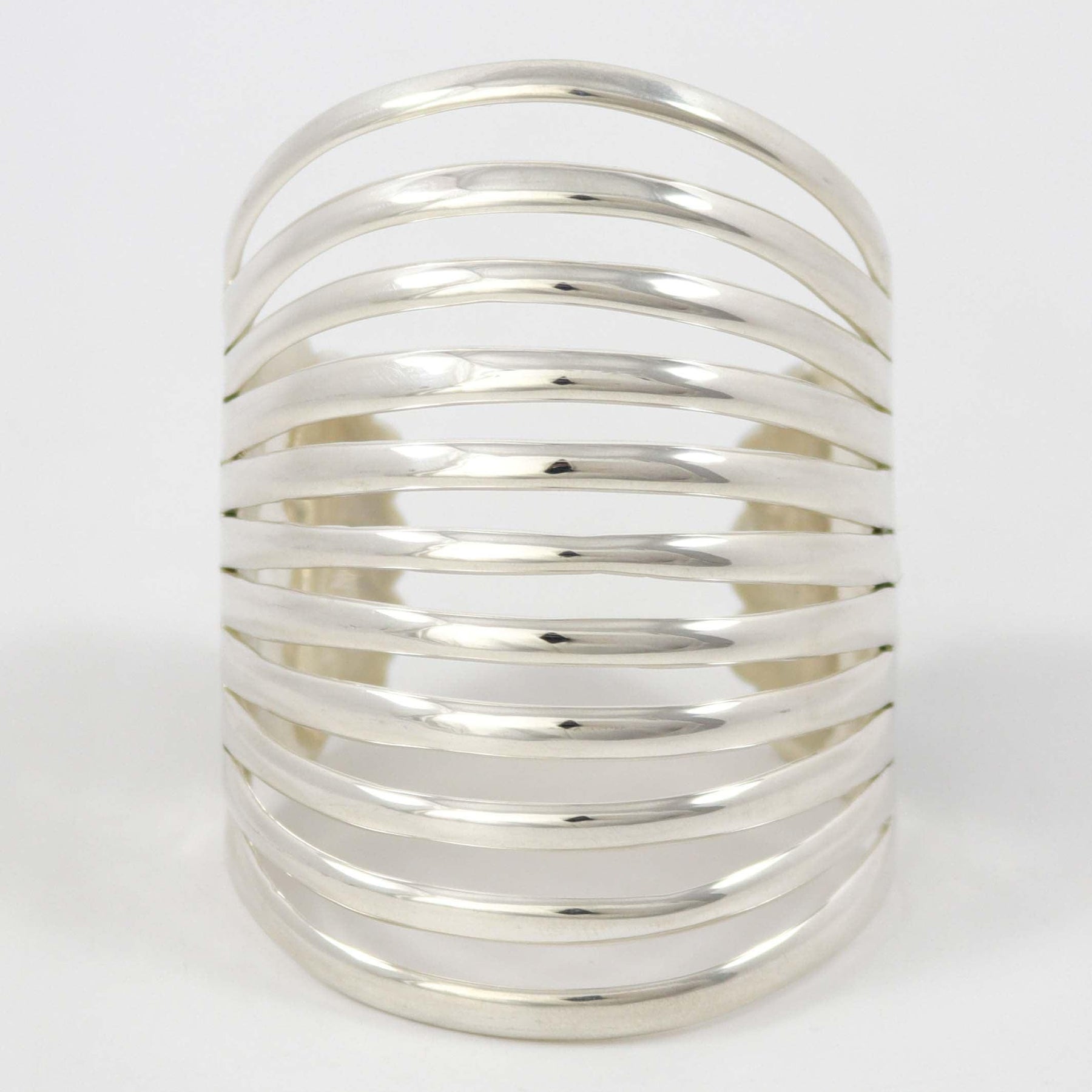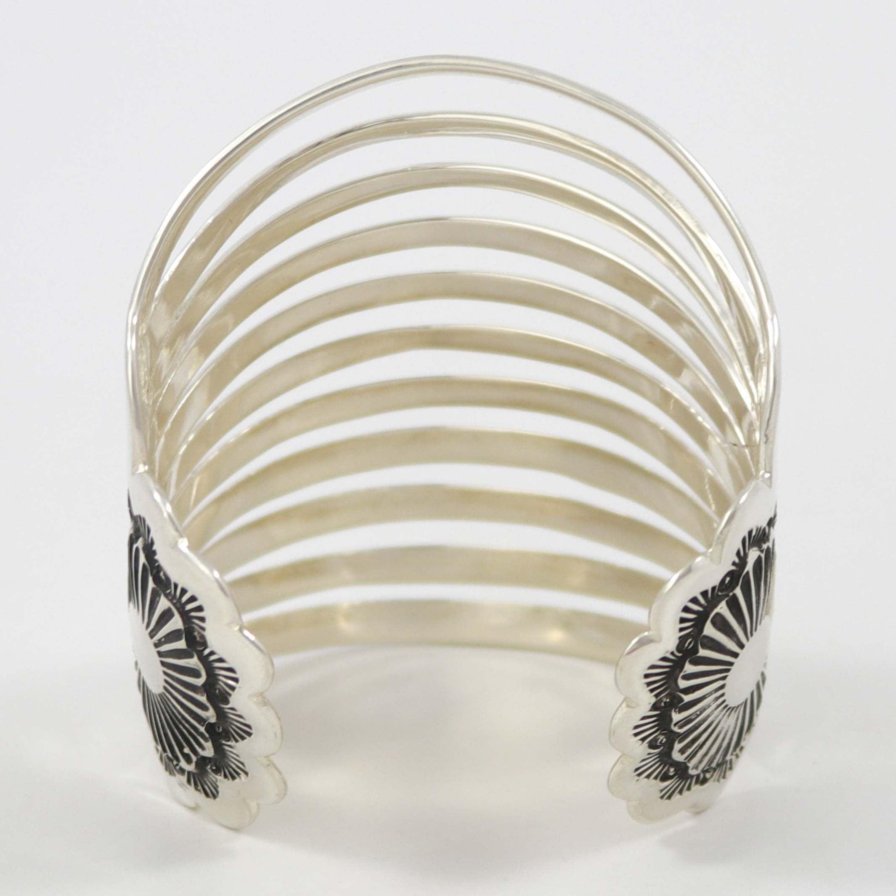 Sterling Silver Split Band Cut Bracelet with Eleven Bands and Hand-Stamped Designs on the Terminals with a Scalloped Edge.