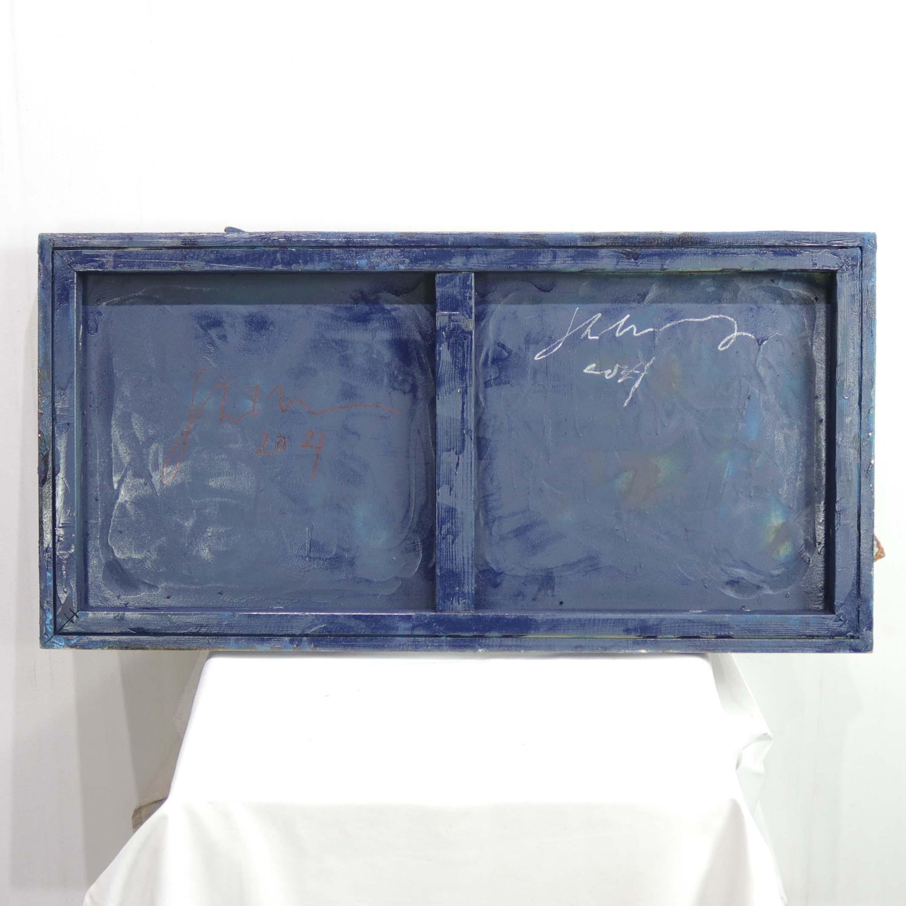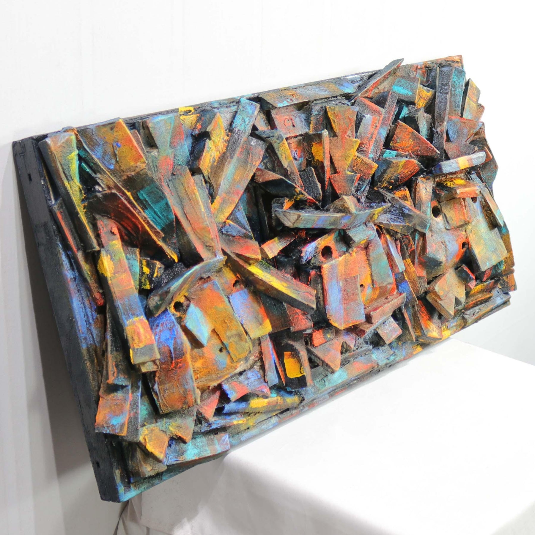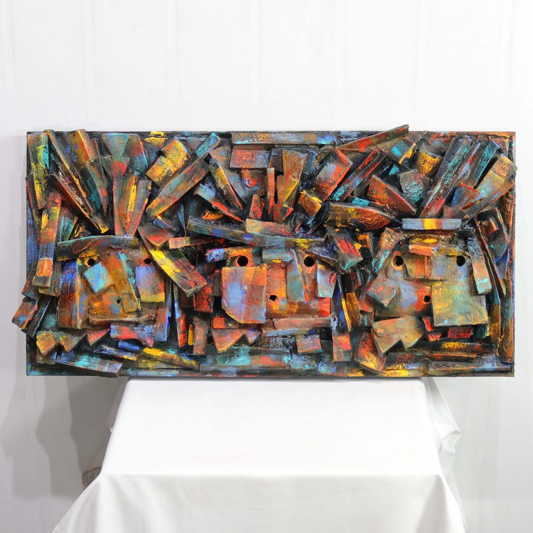 Three-dimensional “Cubis” Wood Art Painting Depicting Three Abstract Yei (Navajo Healing Spirit) Masks, Painted with Brightly Colored Oil Paints by Award Winning Navajo Painter and Sculpture, Sheldon Harvey.