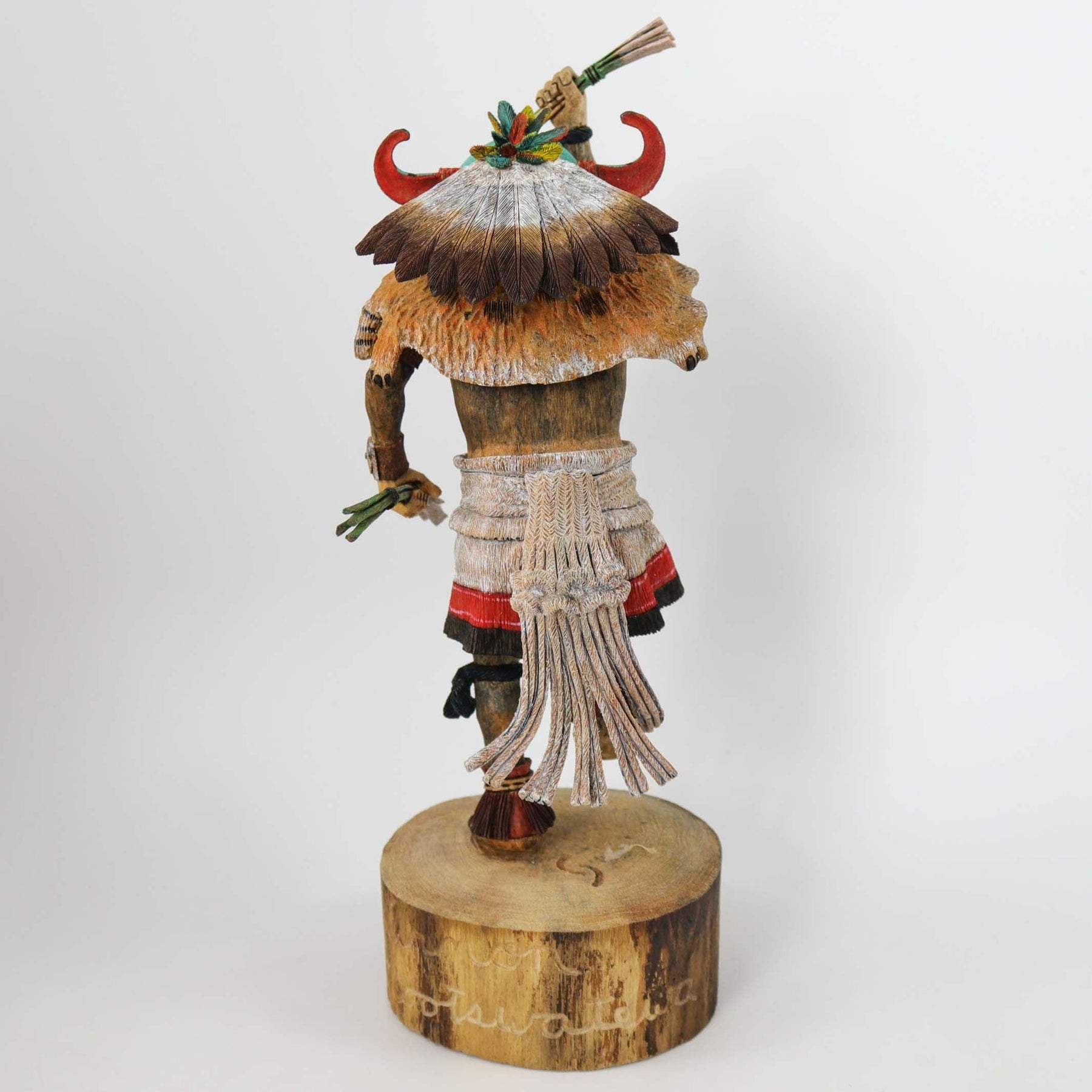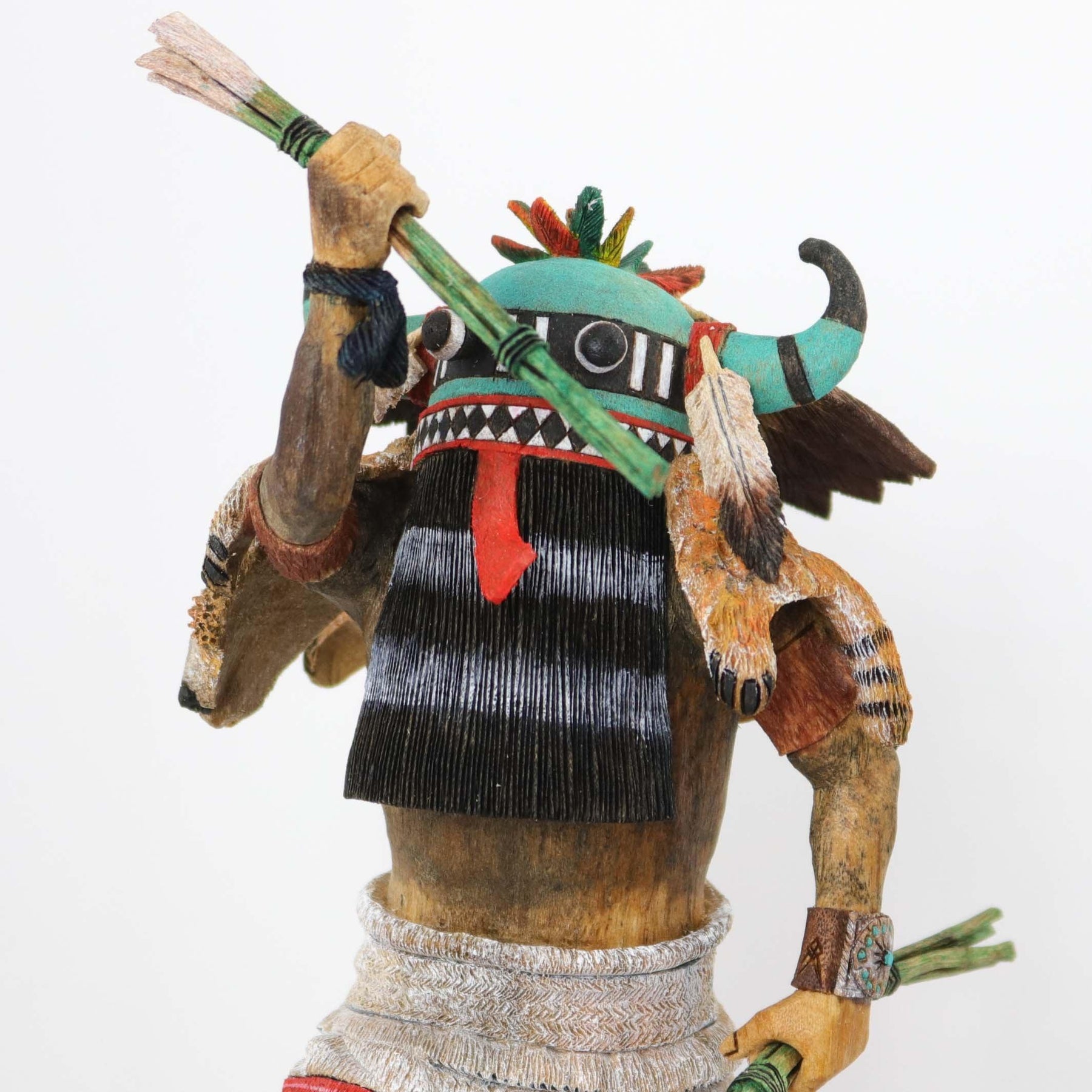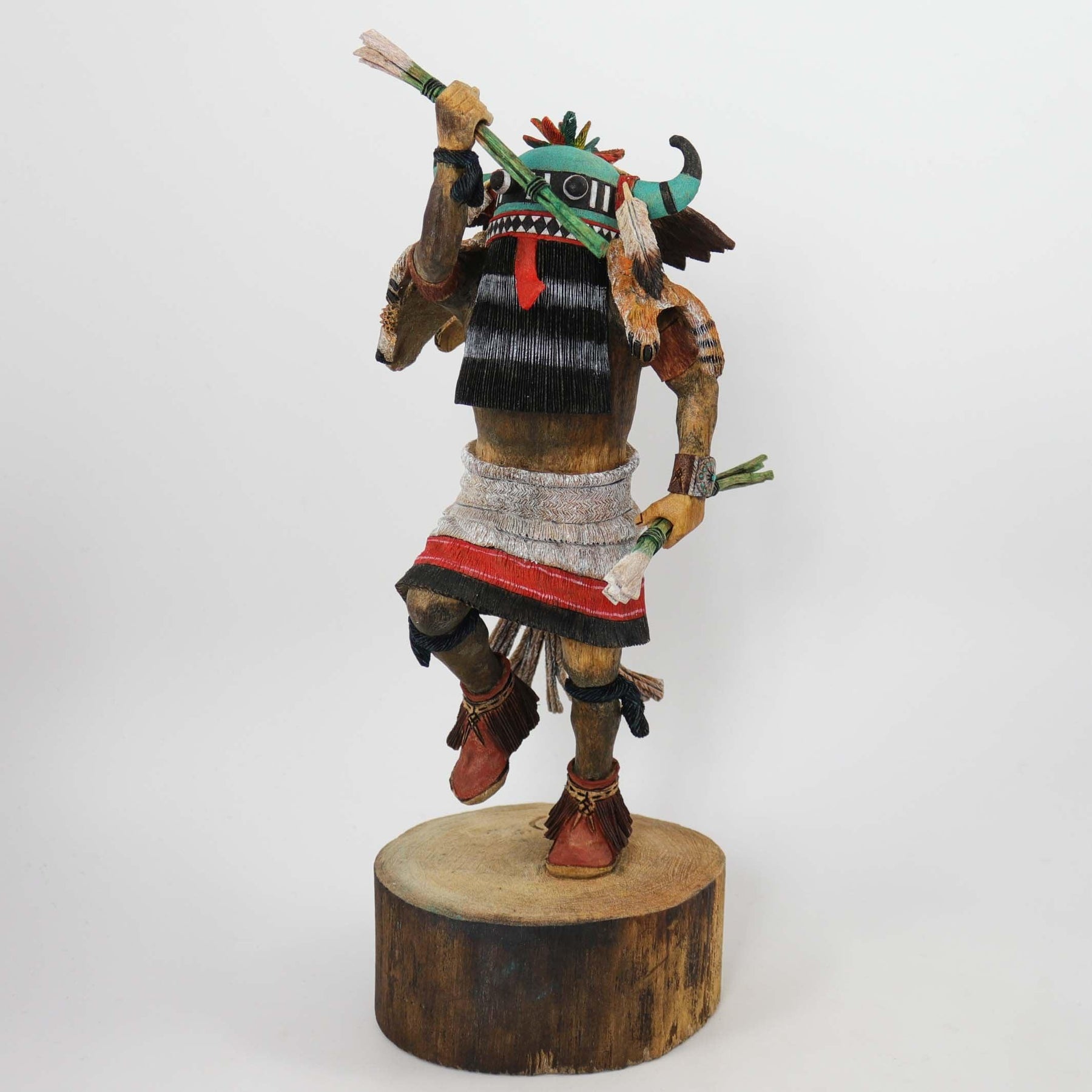 Intricately Hand-Carved and Painted Hopi Whipper Uncle (Tungwup) Kachina Holding Yucca Stalks in a Dancing Motion. This kachina is carved from one piece of cottonwood root. Another masterpiece kachina carving by D'Armon Kootswatewa.