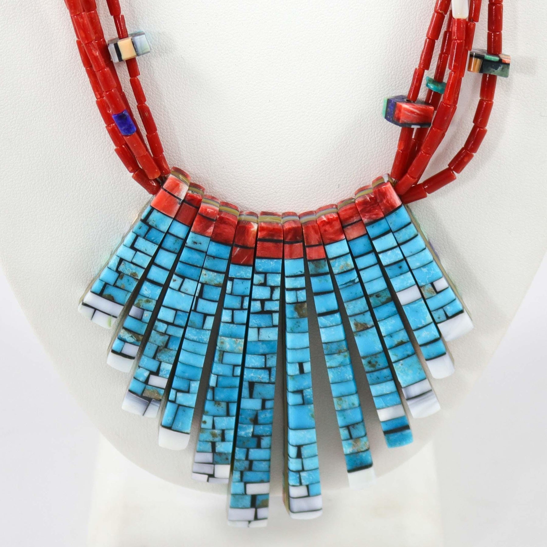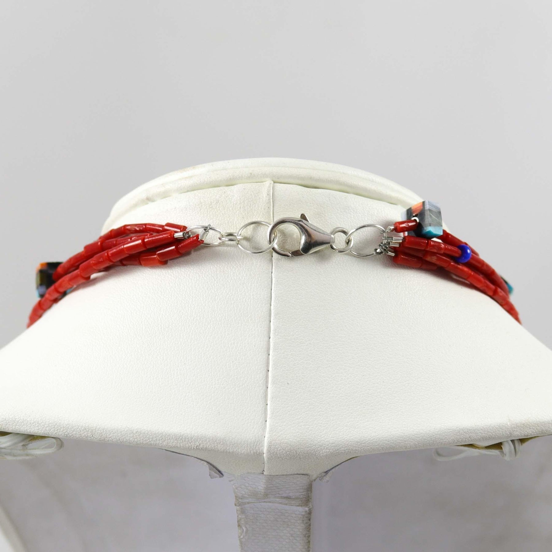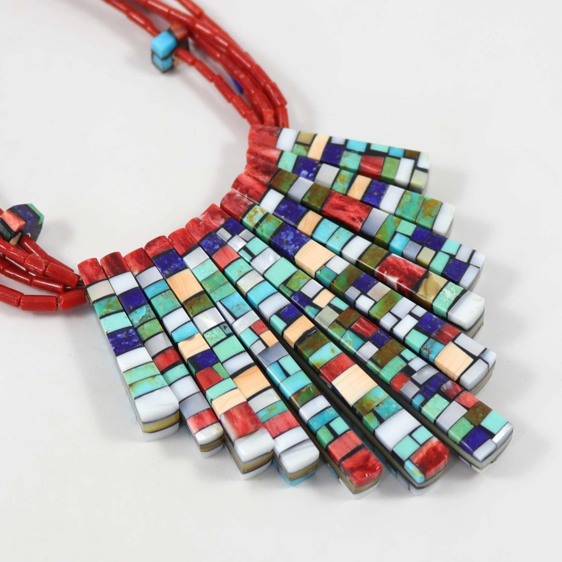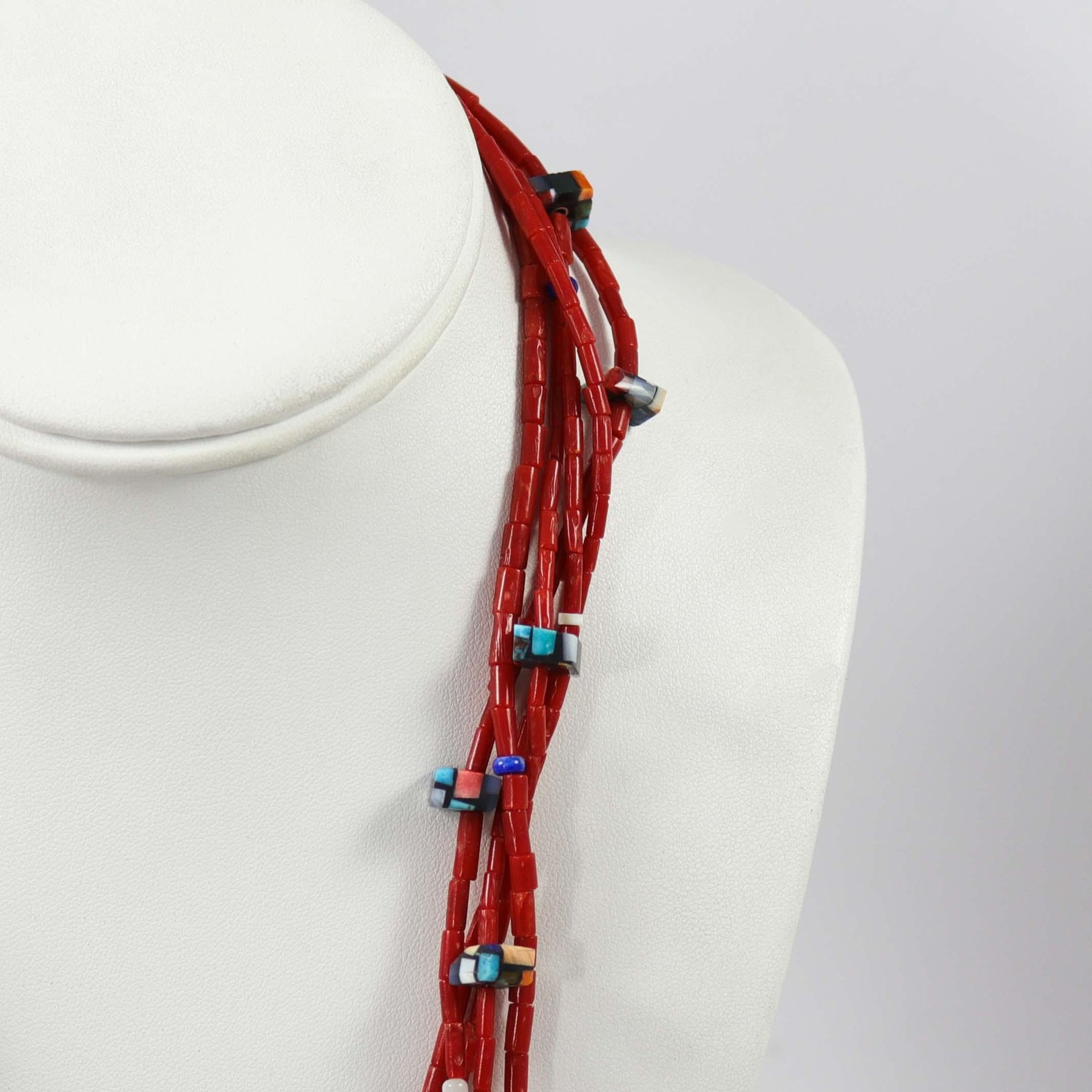 Reversible Five Strand Necklace with Mediterranean Coral Beads and Assorted Inlay Beads. This necklace features 12 reversible tabs with inlay designs on both sides and a sterling silver clasp. Materials include Mediterranean Coral, Turquoise, Spiny Oyster Shell, Lapis, Melon Shell, and Mother of Pearl.