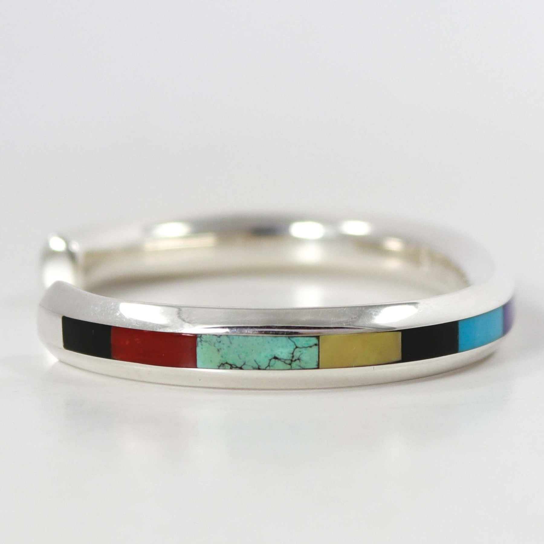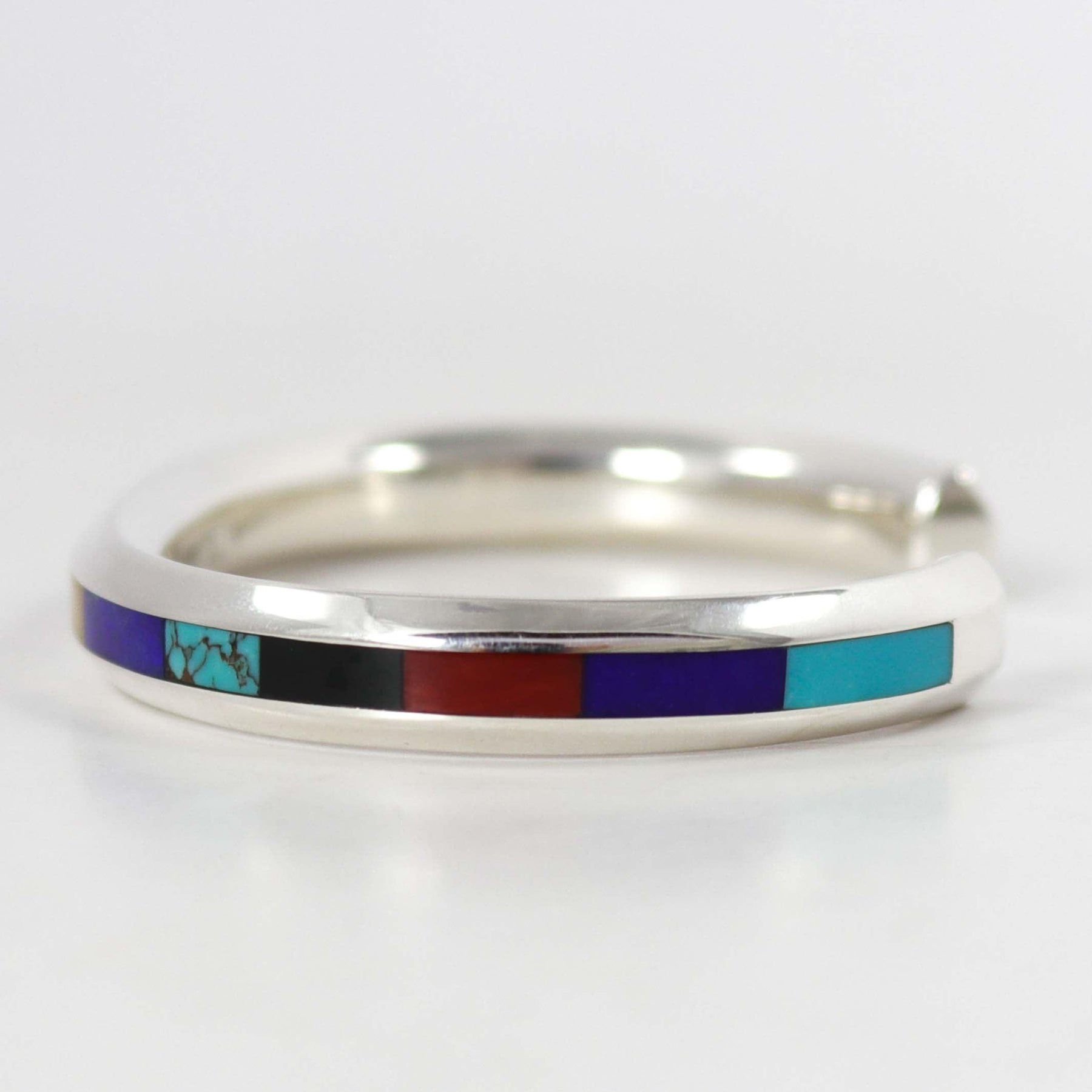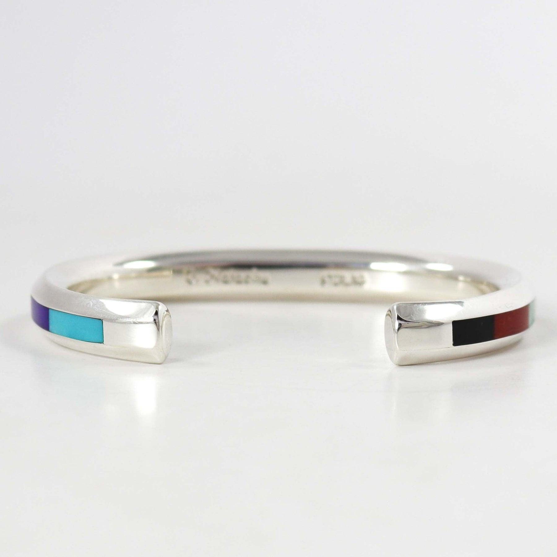 Sterling Silver Cuff Bracelet with Inlaid Turquoise, Lapis, Jet, Mother of Pearl Shell, and Coral.