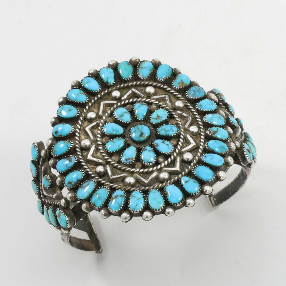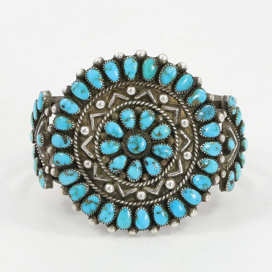 Bracelets are perhaps the most recognized form of Southwestern jewelry. Popular for their diversity in design, we see three primary forms of bracelets: cuffs, link bracelets, and bangles. Cuffs are the most traditional type of bracelet for Southwest Native American silversmiths. Cuffs are rigid metal bracelets that are slipped onto the wrist through an opening. Link bracelets encircle the wrist and are fastened with a clasp. Bangles are rigid, full-circle bracelets that are slipped on over the hand and worn loosely on the wrist. When silversmithing was introduced to the Southwest in the mid-1800s, initially bracelets were all silver, cast or hand hammered into form. By the 1880s, the technique of setting turquoise in silver was introduced and bracelet designs would change forever.
