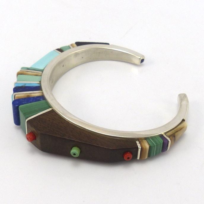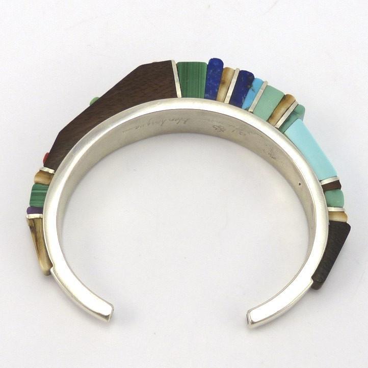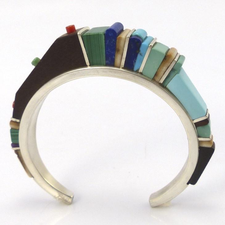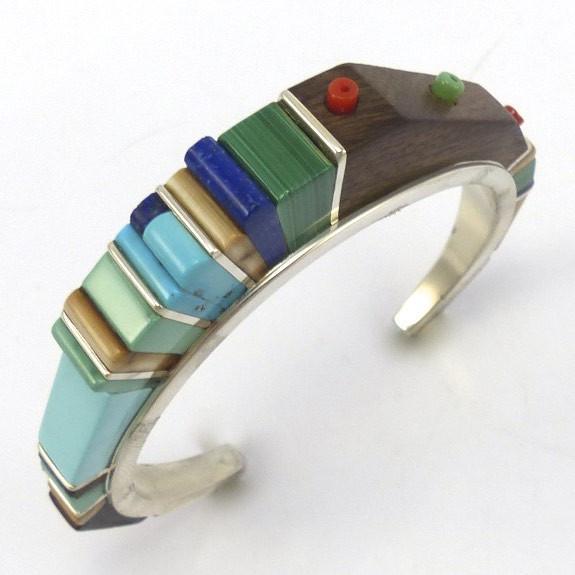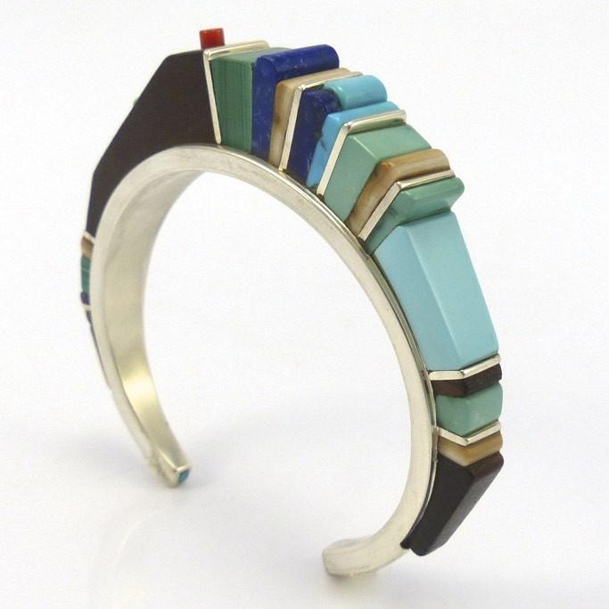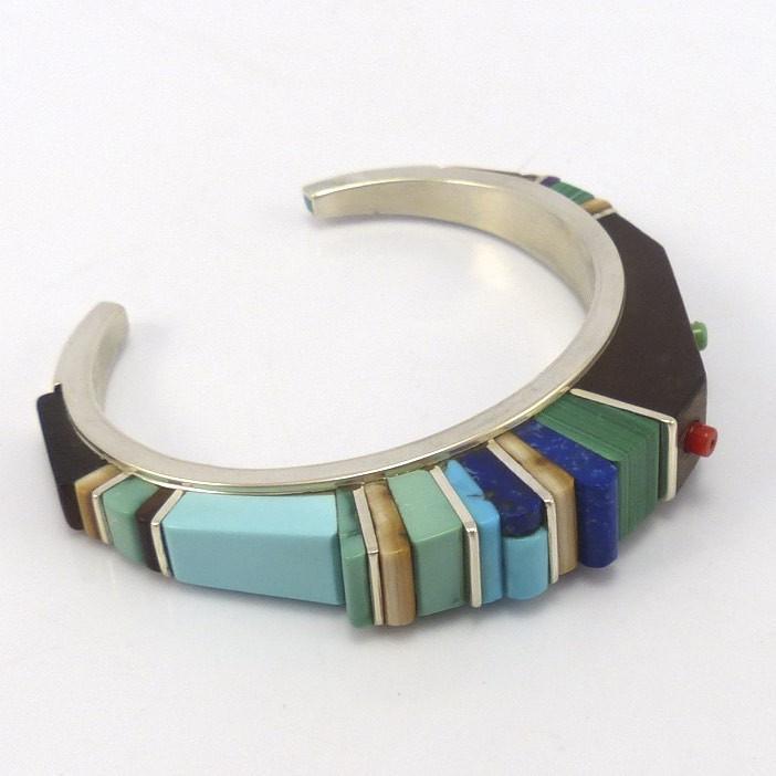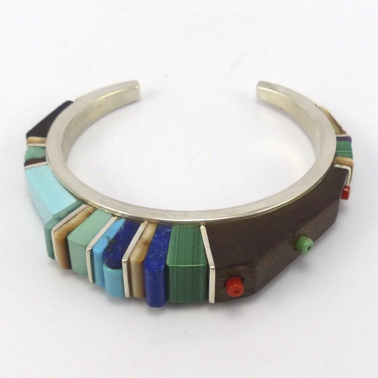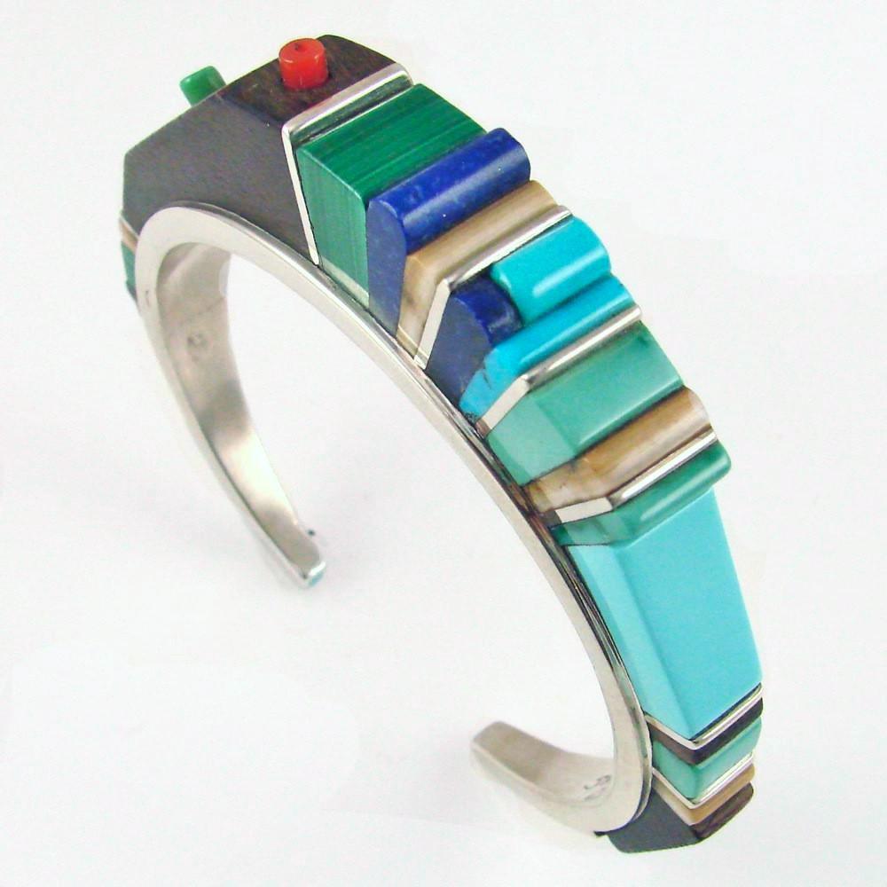 Sterling Silver Cuff Bracelet with High-Rise Cobbled Inlay using Turquoise, Coral, Lapis, Malachite, and Fossilized Mastodon Ivory.