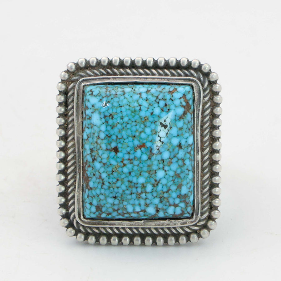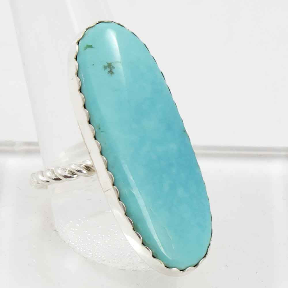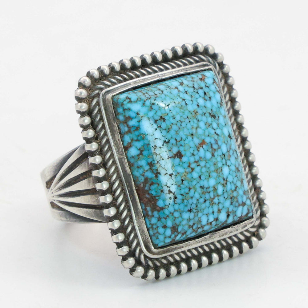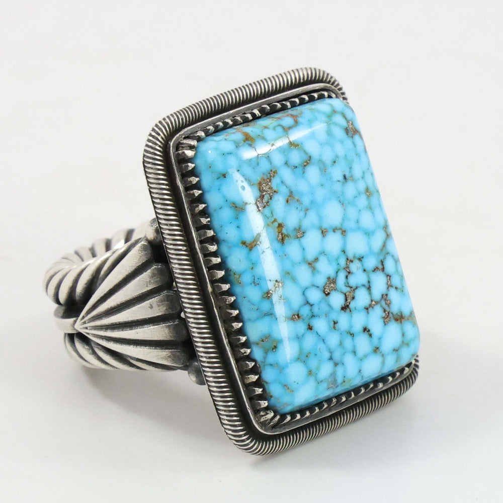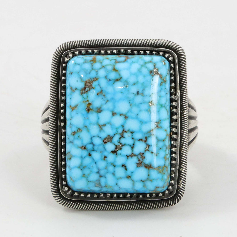 キングマン ターコイズ鉱山は、アリゾナ州キングマン近郊のセルバット山脈にあります。他の多くのターコイズ鉱山と同様に、この地域は 1800 年代後半にジェームズ ハースによって再発見されたときに、銅の採掘事業として始まりました。キングマン ターコイズは 1950 年代から 1970 年代にかけて人気を博し、その鮮やかなブルーはアメリカン ターコイズの典型的な外観になりました。キングマンにはさまざまな青緑色の色合いがありますが、ハイグレードのキングマン ターコイズは、タイトで暗いクモの巣のマトリックスと黄鉄鉱のタッチを伴う深い青色の色合いで知られています。キングマン鉱山は現在も操業を続けており、美しいターコイズを大量に産出し続けています。実際、キングマン鉱山は南西部の他のすべての鉱山を合わせたよりも多くのターコイズを生産していると主張する人もいます。キングマン地域には、