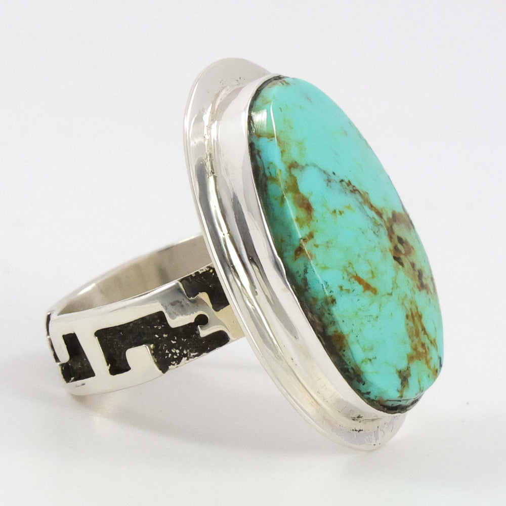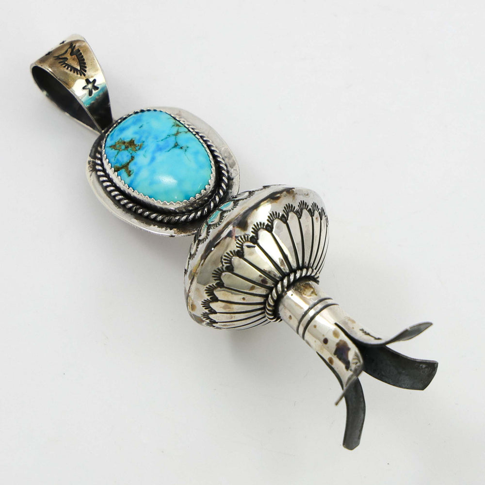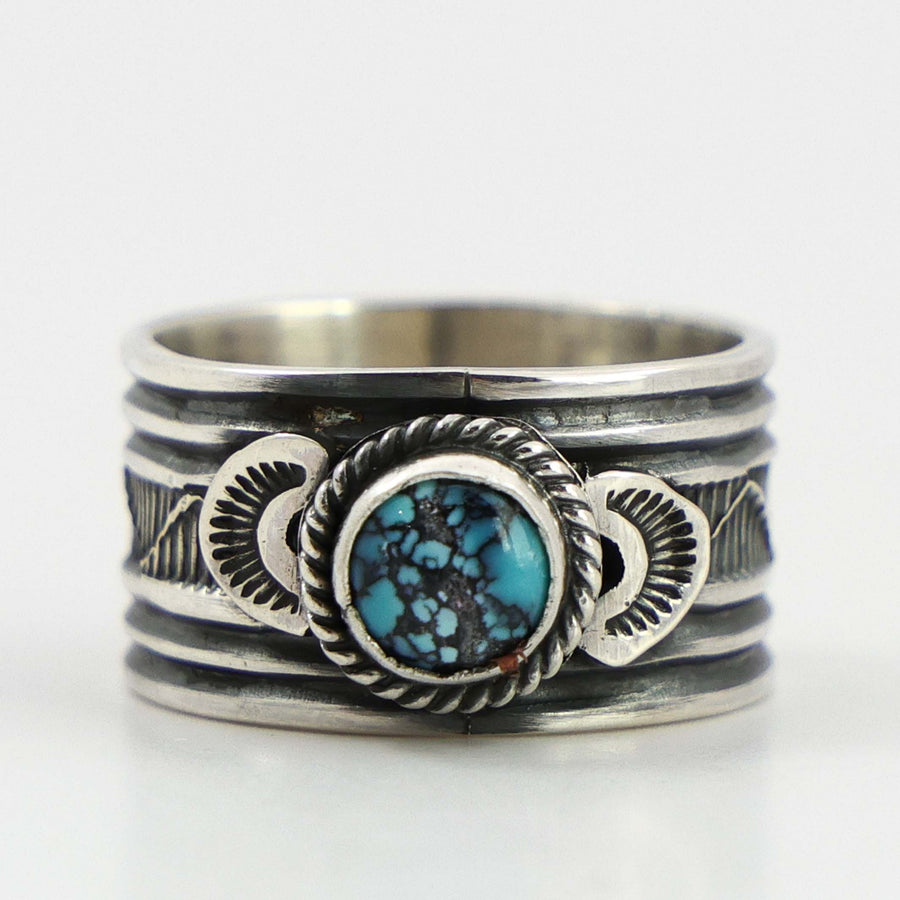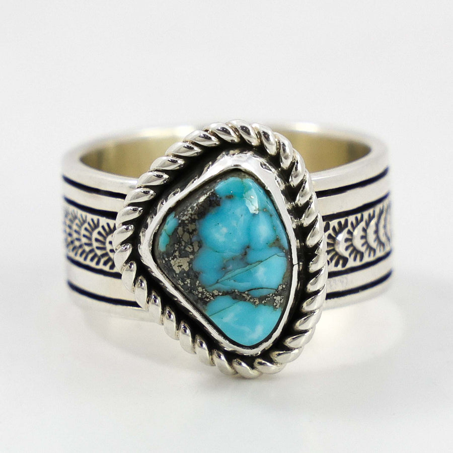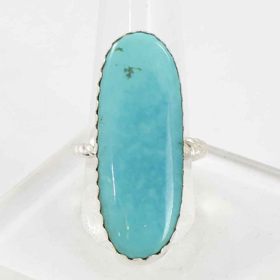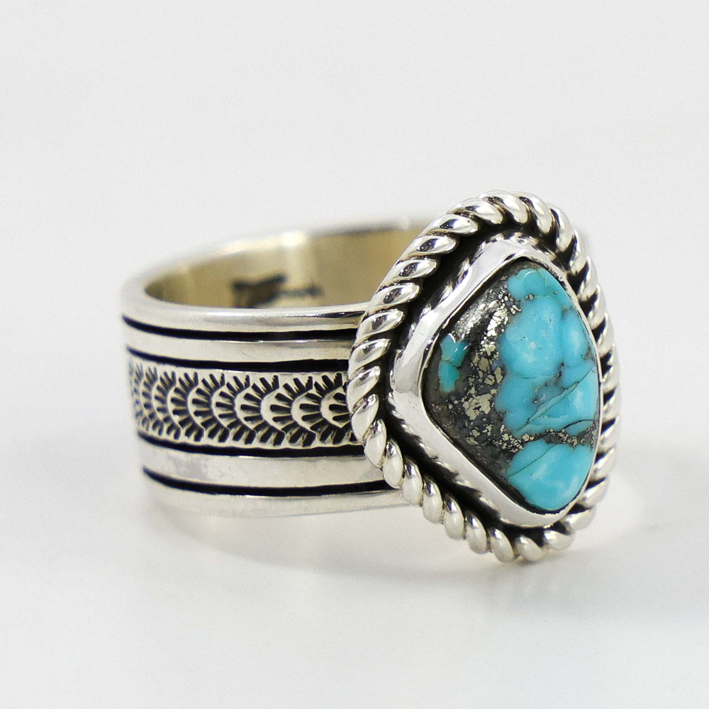 キングマン ターコイズ鉱山は、アリゾナ州キングマン近郊のセルバット山脈にあります。他の多くのターコイズ鉱山と同様に、この地域は 1800 年代後半にジェームズ ハースによって再発見されたときに、銅の採掘事業として始まりました。キングマン ターコイズは 1950 年代から 1970 年代にかけて人気を博し、その鮮やかなブルーはアメリカン ターコイズの典型的な外観になりました。キングマンにはさまざまな青緑色の色合いがありますが、ハイグレードのキングマン ターコイズは、タイトで暗いクモの巣のマトリックスと黄鉄鉱のタッチを伴う深い青色の色合いで知られています。キングマン鉱山は現在も操業を続けており、美しいターコイズを大量に産出し続けています。実際、キングマン鉱山は南西部の他のすべての鉱山を合わせたよりも多くのターコイズを生産していると主張する人もいます。キングマン地域には、